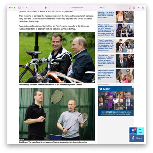 2011年の記事によると、撮影されたのはモスクワ郊外のゴーリキイ公園。プーチンが首相であり、大統領への復帰が取り沙汰されていた頃だ。静かな公園にカメラのシャッター音がマシンガンのように鳴り響く。つまり広報用の撮影セッションだ。相方との友好関係を示し、ラフな服装で余暇を楽しむ穏健な姿を伝えたいのだろう。映像の後半にはバドミントンに興じる様子まで登場する。