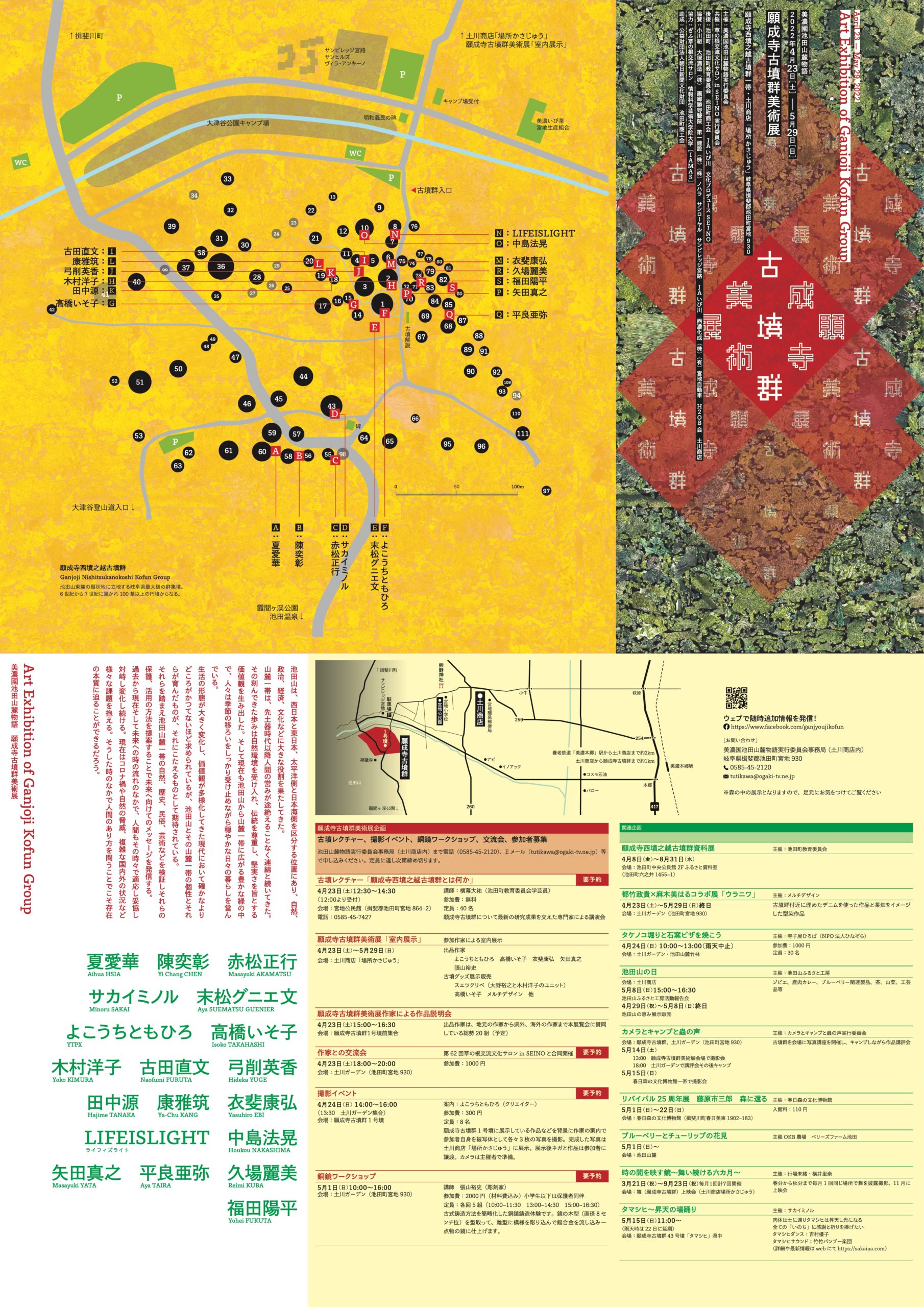2022年4月23日から開催される願成寺古墳群美術展で、自転車を用いた作品を出展します。この展覧会は111基もの古墳が群集する願成寺西墳之越古墳群での現代アートの野外展示で、今回は国内外20組の作家が参加している。緑豊かな自然と千数百年前の遺構の中での展覧会は全国的にも珍しい。しかも、前身となる展覧会を含めると2008年から続く本展は今年で完了となるとのこと。