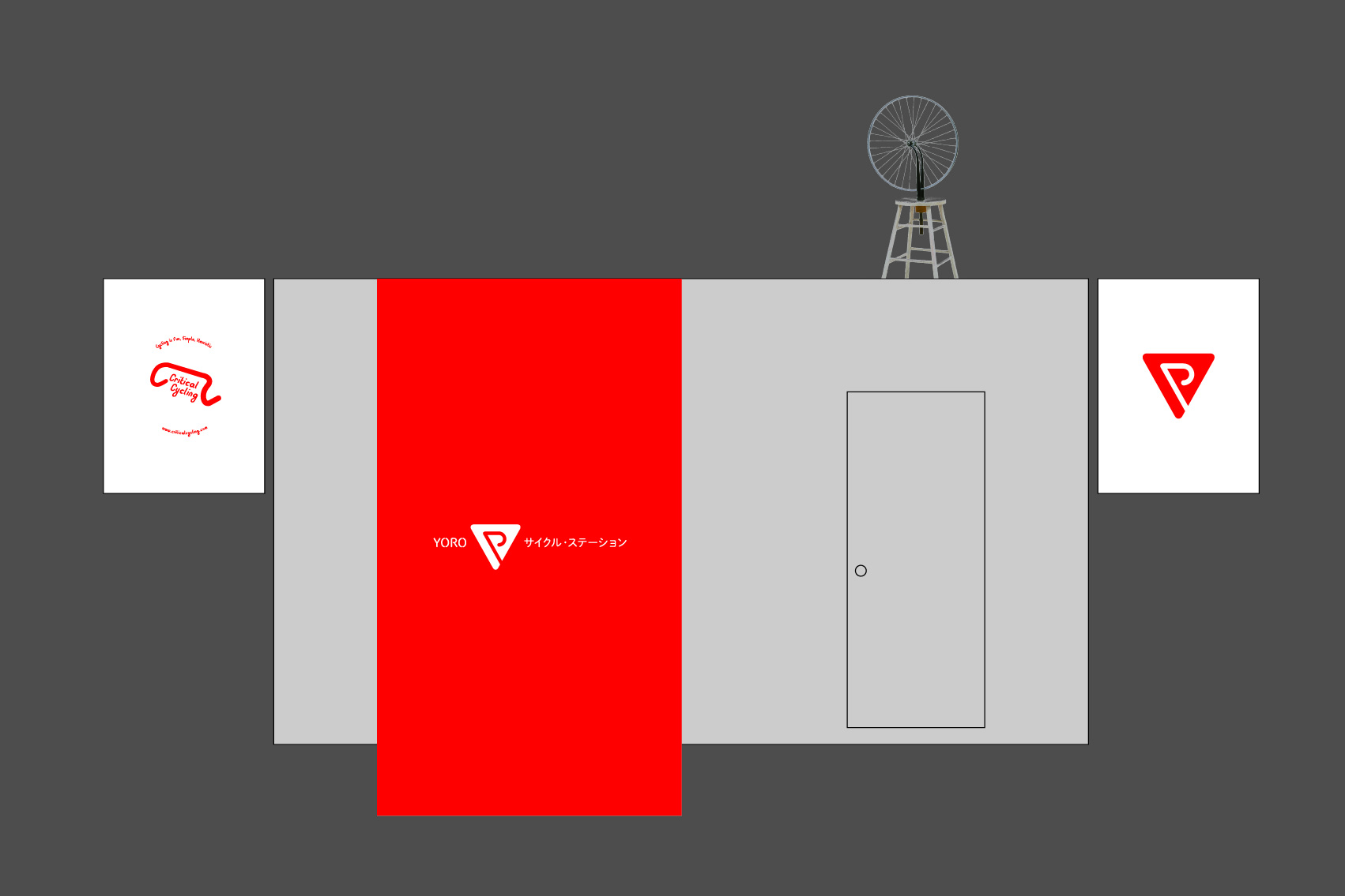 2018年に製作した「サイクル・ステーション」のためのバナーデザイン。本来ならサイクルの「C」やステーションの「S」も考えられたが、ここではパーキングの「P」を暗示させるシンボルをデザインした。Critical Cyclingと同様に写真から形をおこしたわけではないが、ドロップハンドルとフロントフォークを見立てた。逆三角で囲んだ理由は、Pの傾斜と三角の辺を合わせ、並列して扱われるCritical Cyclingのシンボルに付随する円弧と対応させることを意識した。またどちらも金属チューブを曲げた形状として関連づけている。