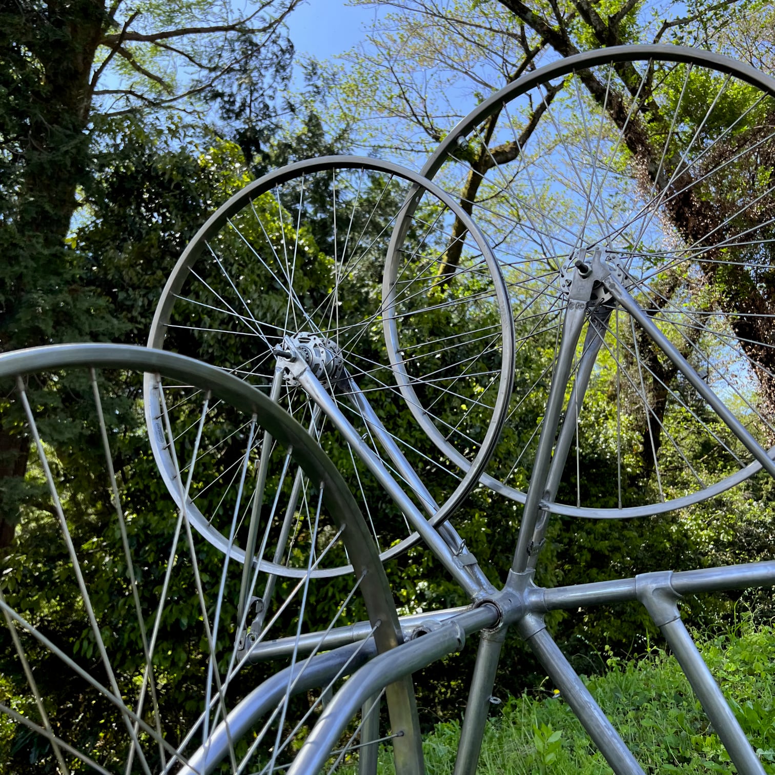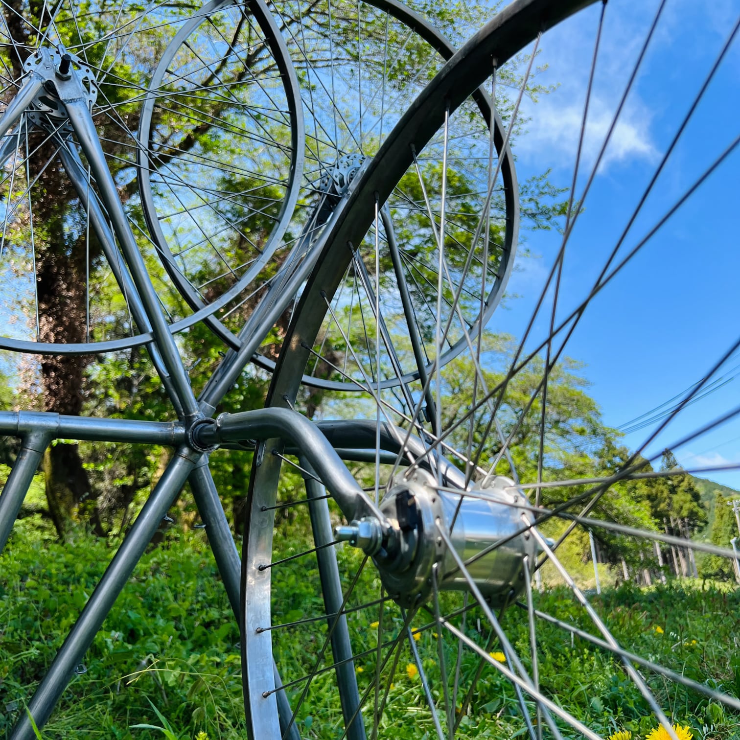 This work was exhibited as an outdoor exhibit at the Ganjoji Kofun Group Art Exhibition 2022, and was installed on the east side of Tomb No. 55 of the Ganjoji Nishifun-no-koshi Kofun Group. It was right next to the road that runs through the foot of the mountain, and was a place with a good view. The bicycle frame and wheels used as materials were highly polished, and shone silver in the light, making them stand out. However, three days after installation, before the opening of the art exhibition, the work suddenly disappeared in a short period of time during the day on a weekday. The details of this are as follows.