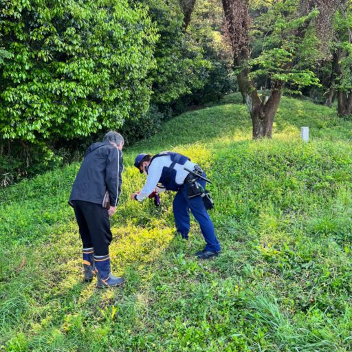 【追記】美術展の会期が終了した時点でも、消失した作品が再び現れることはなかった。設置場所を訪れたところ、古墳を覆う雑草が十数センチに伸びている。その草を掻き分けると作品を固定していた金具が変わらずに存在していた。古墳は文化財であるので、金具を回収して原状復帰したことを報告する。(2022.05.30)