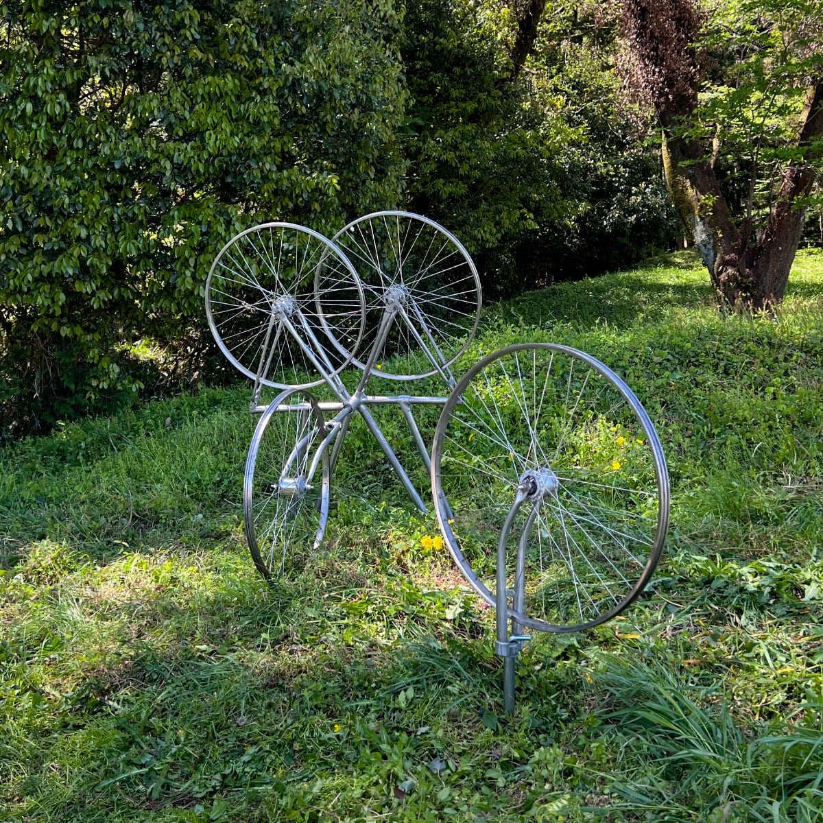 本作品は願成寺古墳群美術展2022の野外展示として出展し、願成寺西墳之越古墳群の55号古墳の東側に設置した。山裾を抜ける道路のすぐ脇であり、見晴らしの良い場所であった。素材として用いた自転車のフレームや車輪は磨き上げられており、光を受けて銀色に光って目立っていた。ところが、設置して3日後、美術展の開幕前に作品は平日昼間の僅かな間に忽然と消えて無くなった。その経緯は以下の通り。