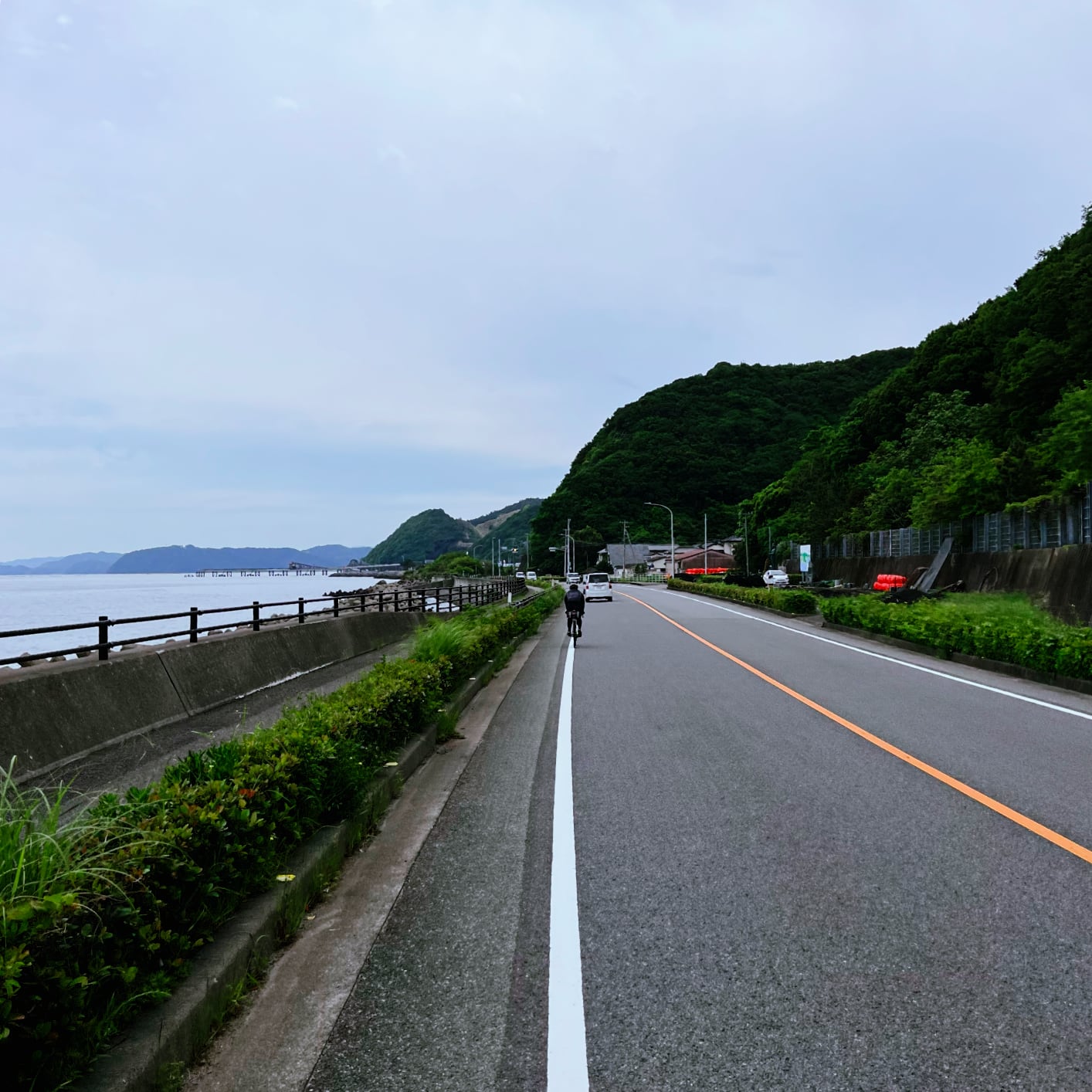 山を下り、水田と住宅地を抜けると、そこからは海岸線を緩やかにカーブする眺めの良い道が続く。遠くに淡路島が見える。昨日見た四国から、今日は見返しているわけだ。このあたりも路面が良くないものの、側道は安全で走り易そうであった。しかし側道への標識がなく、途中は生垣が途切れないので車線変更ができない。少しだけ配慮があれば快適な自転車走行ができるだけに残念なところ。