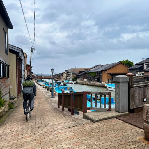 翌日、早朝に高岡市に移動して、現地在住の知人サイクリスト3人と合流。彼らの案内で富山湾岸サイクリング・コース全長102kmのうち、西側ルートを走る。まずは雨晴海岸を出発して南東へ。生憎の曇り空で風も強かったが、晴れていれば海越しに立山を臨む絶景サイクリングになるそうだ。やがで港湾地帯に入り、船舶や倉庫、海鮮市場などウォーターフロント情緒にひたりながら走る。