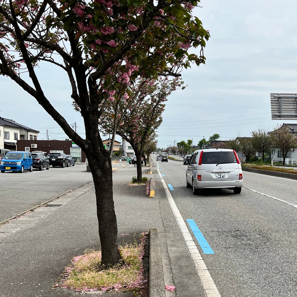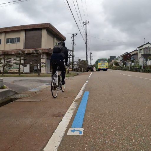 サイクリング・コースは路側帯にナビゲータ・ラインが引かれている。連続する実線ではなく、数メートルごとの青い破線ながら、視認性は十分に良い。ただ、曲がり角手前に描かれる矢印は小さく見落としがち。しまなみ海道でも感じたように、間違ったところに大きくバツ印を描くといったフェイル・セーフが欲しい。なお、赤茶けた路面や摩耗したラインは冬の雪対策の弊害らしく、その苦労がしのばれる。