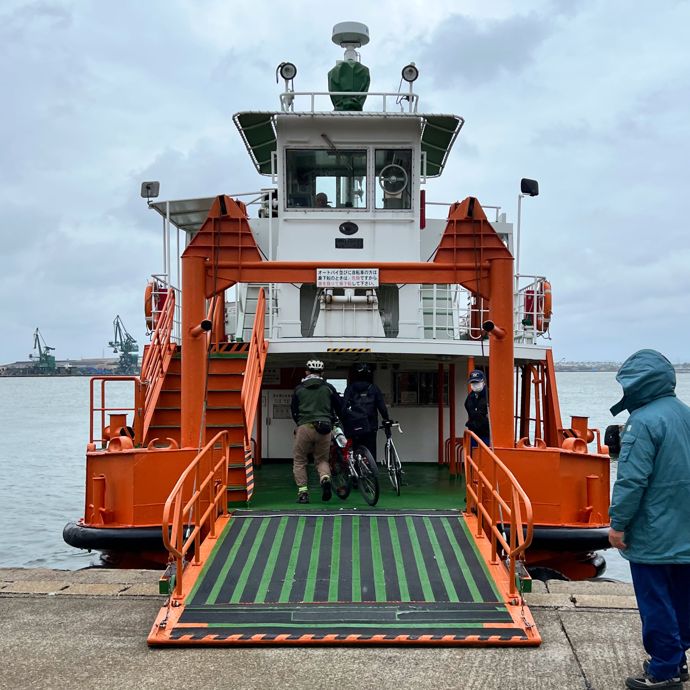 海洋丸の公園に立ち寄った後、次は優美な新湊大橋。自転車とともにエレベータで50mほど上昇、自転車を押して480mの橋桁通路を歩いて渡る。これもサイクリング・コースの一部だから面白い。そしてここからは知人推薦の拡張ルートを辿ることになる。まず橋を渡ったたもとから、港を展望しながら渡船で元へ戻る。橋も船も晴れていれば爽快だろが、薄暗く強風に煽られるのは異様な迫力がある。