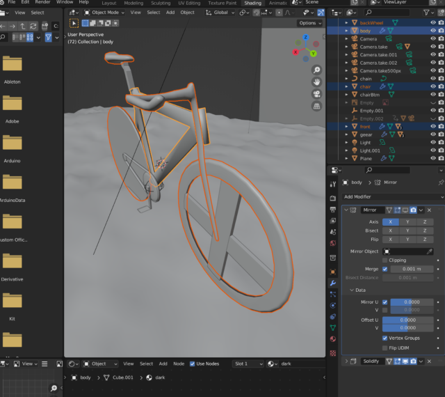 モデリングをしていての気づきとしては自転車というものが構造上線対称であるため、ボディ、フロントハンドル、車輪まで、線対称に片側のモデリングのみ作成し、「ミラーエフェクト」(特定の軸を元に左右対称に複製するエフェクト)を適用することで形状が完成する。