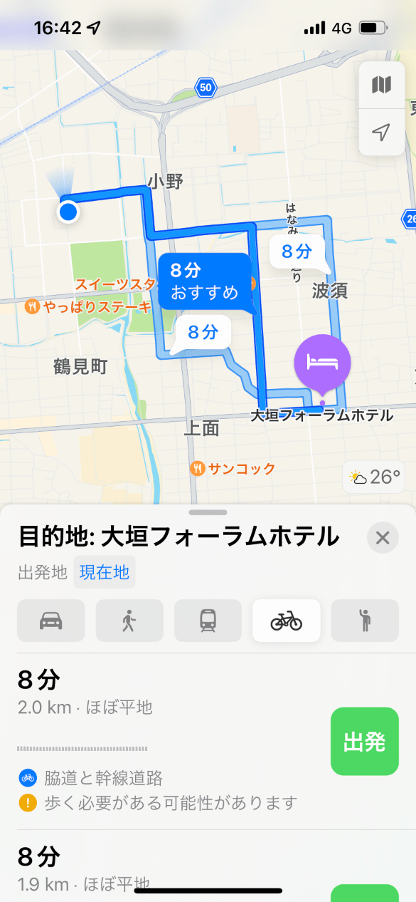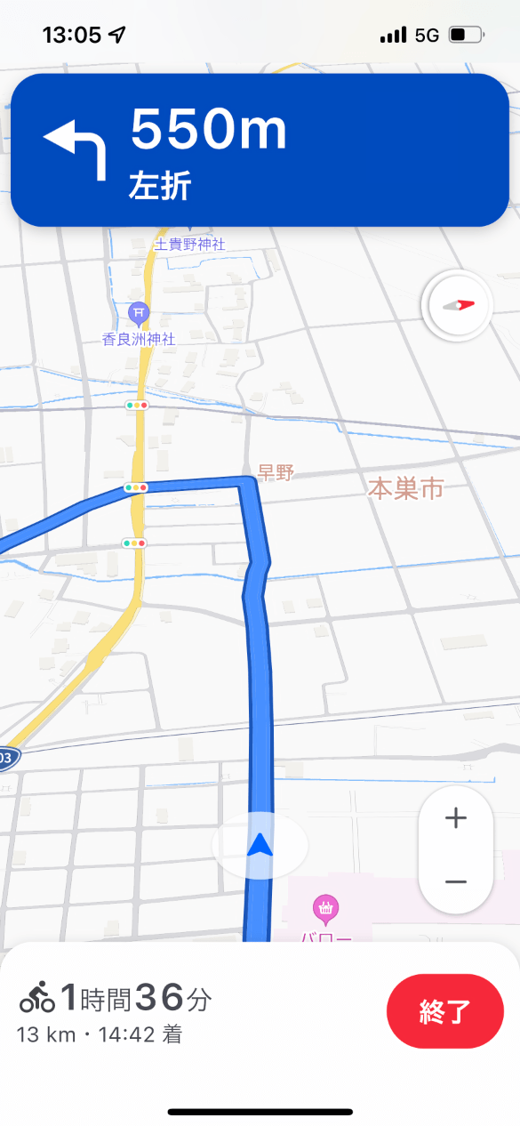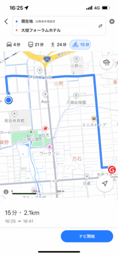 遠方の目的地を含めて何度かナビゲーションを利用したところ、Appleマップは自転車で走り易く、かつ楽しかった。これは脇道が多く交通量が少なく、ルートが変化に富んで刺激的だからだ。自動車では脇道が多いと困惑するが、自転車では楽しく思えて愉快。それだけにYahoo!マップでは交通量が多くて安心して走れず、直線的で単調なのが面白くない。施設の裏口に案内されたこともあった。