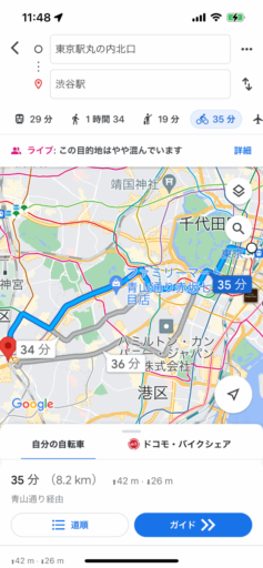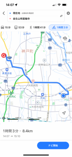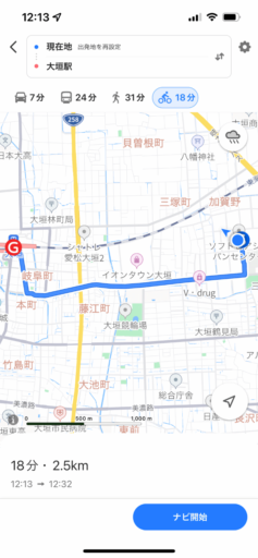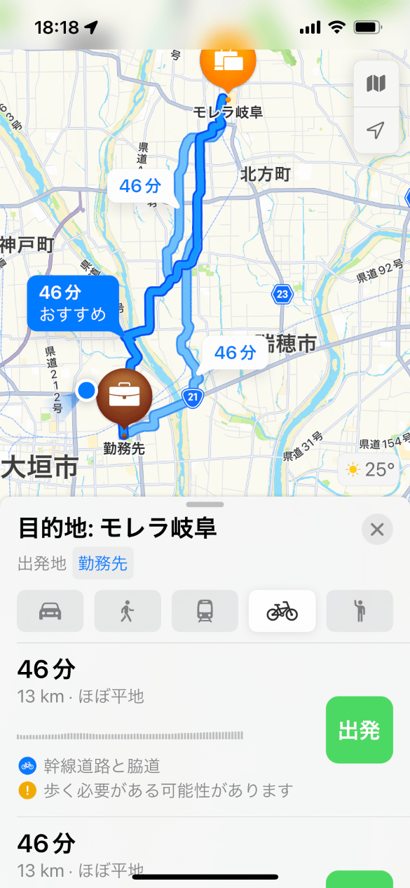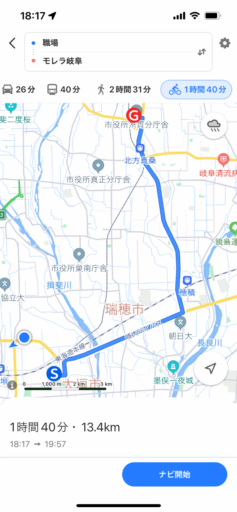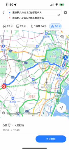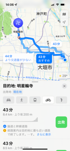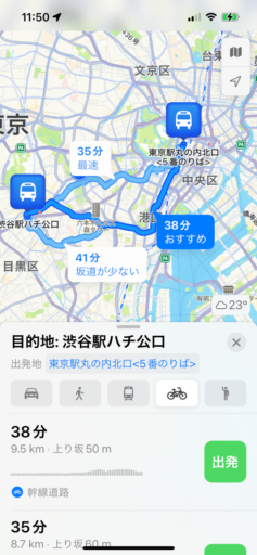 もうひとつ重要なのが所要時間の予測。Appleマップでは自転車の速度を15〜18km/hに想定しているようで、これは筆者の走行に近く、予測された時刻に大差なく到着する。一方、Yahoo!マップは8km/h程度と遅く、予想所要時間は長くなる。これはママチャリなどでゆっくり走る速さだろう。ナビゲーションして走るうちに機械学習して補正するのだろうか? 少なくとも自分の速度を設定したいところ。