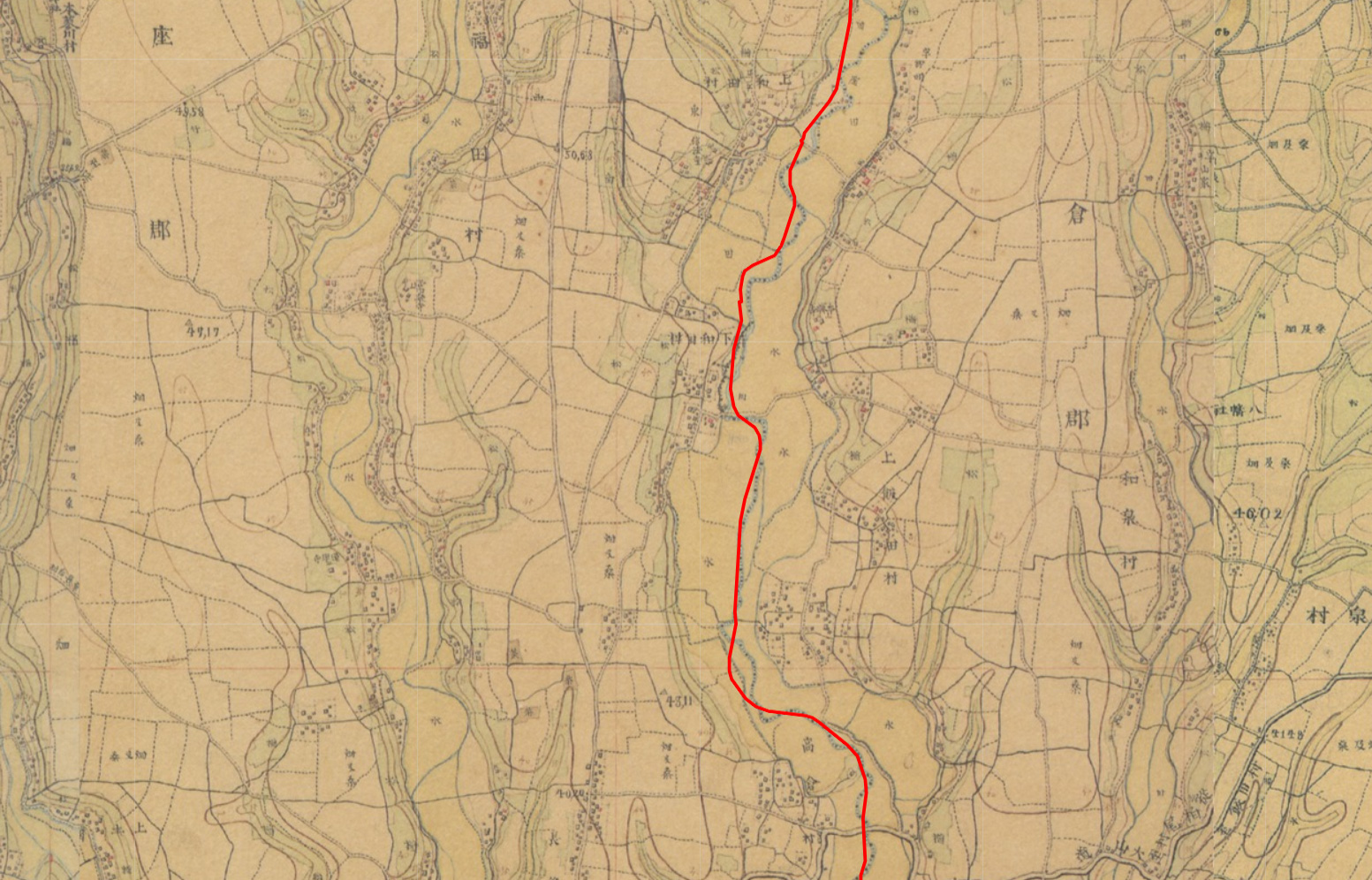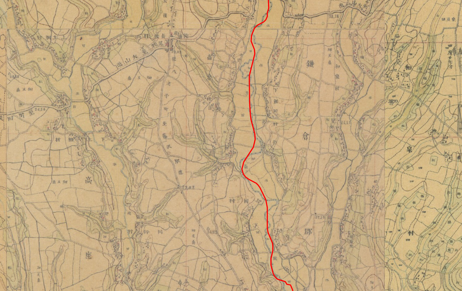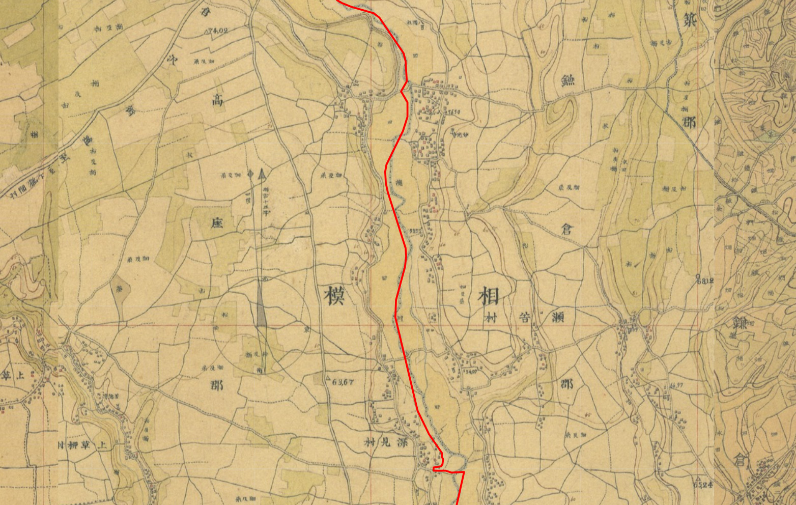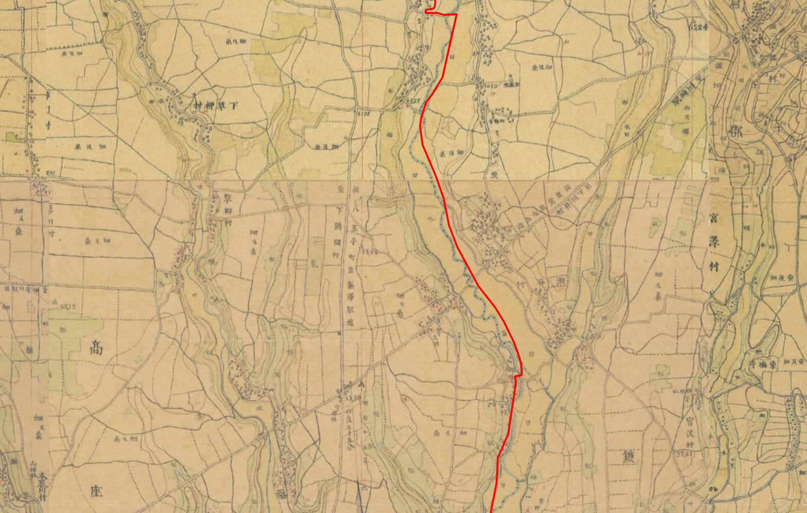 待ち合わせと出発は調布市内だったが、多摩川沿いを少し下り登戸へ橋を渡るところが気分的には今回のスタートだ。多摩川の支流である五反田川を登戸村から遡り、生田村を抜けて高石村へと走る。川が刻んだ谷を、現在は津久井道と小田急線が通っている。百合ヶ丘の駅の辺りが源流の一つで、ここを登って新百合ヶ丘の向こうへ越えると多摩川水系から離脱したことになる。