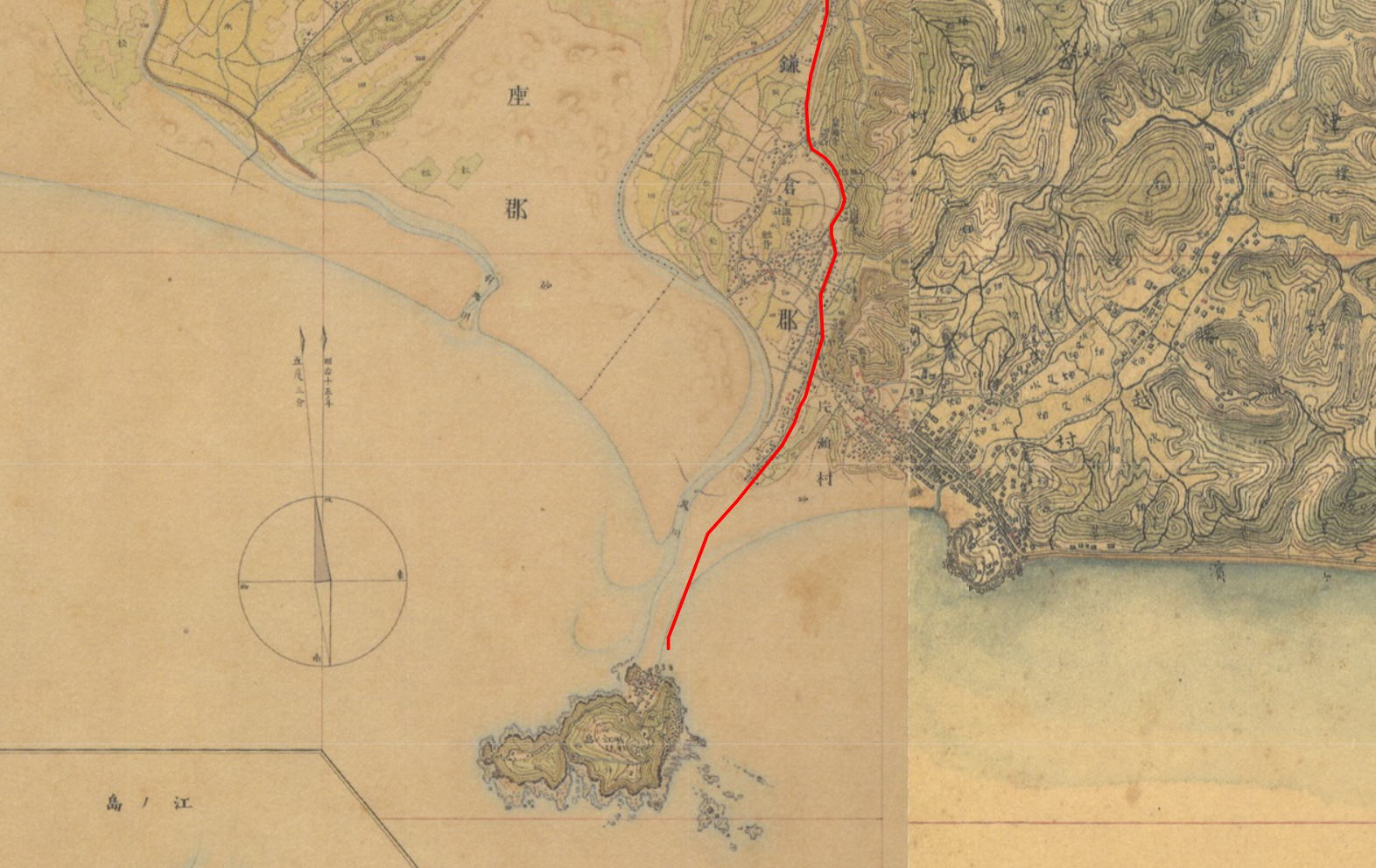 梅雨の合間の土曜日、仲間と江の島へ出かけた。複数の川筋を辿るアップダウンの少ないルートで、昼頃から数時間のサイクリングだ。あまり写真も撮らなかったので、明治期の「迅速測図」上にルートを描画し、つい最近の体験を百数十年前の土地の姿に重ねて振り返ってみることにする。