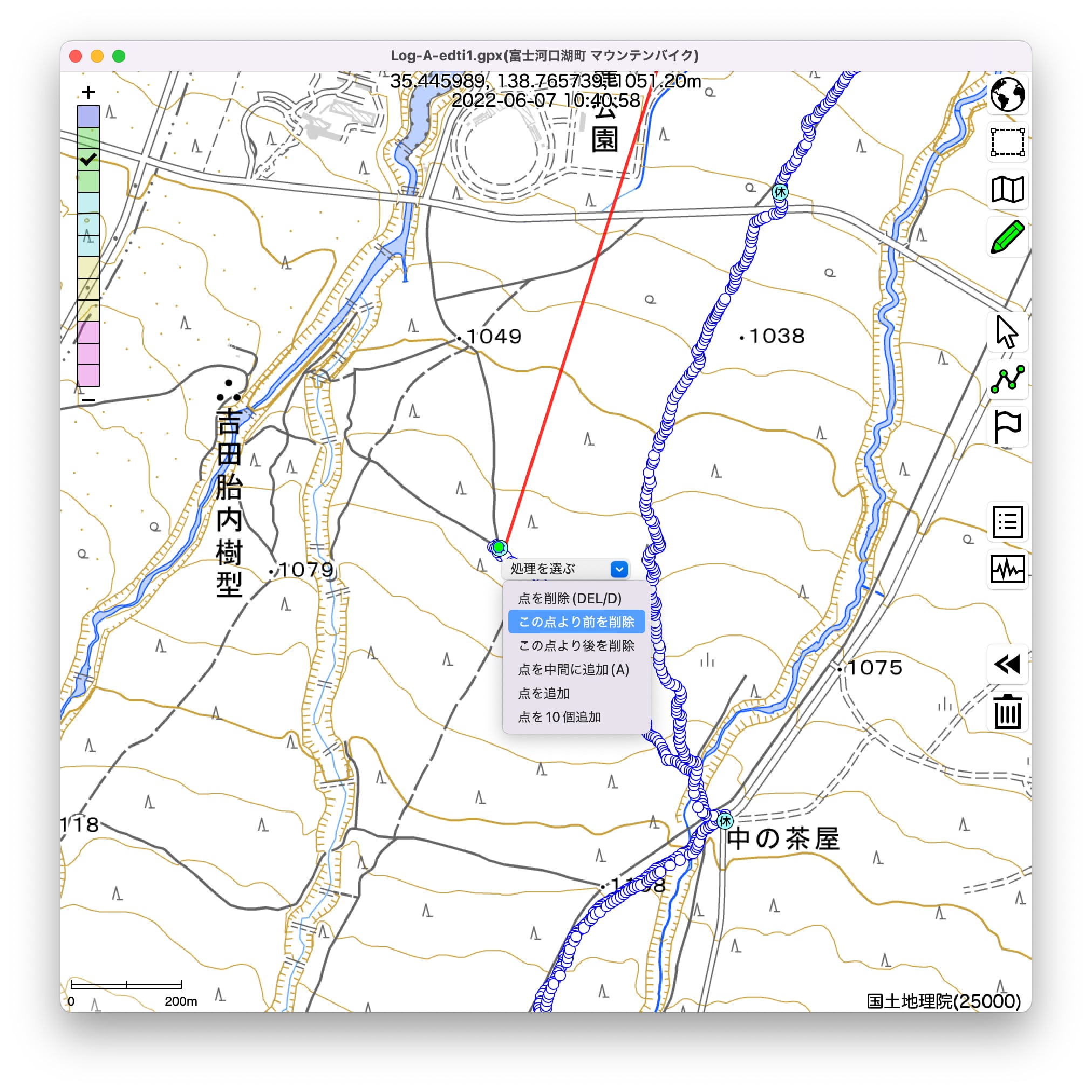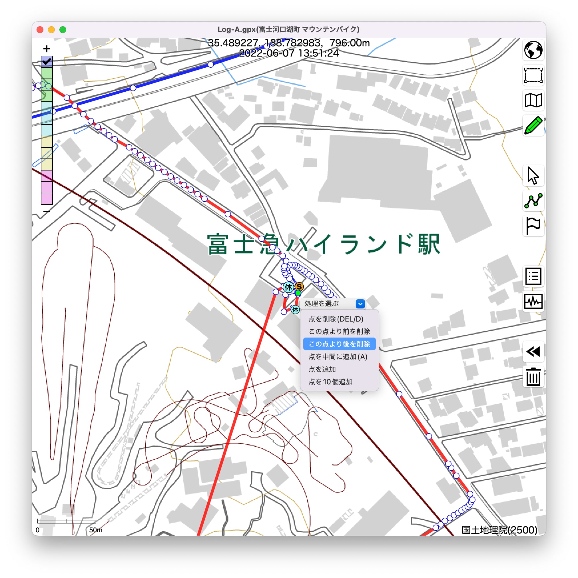 まずはライド終了後の不要なデータを削除しよう。トラック画面(鉛筆アイコン)を選び、さらにトラック編集(小円と線のアイコン)を選ぶ。これでルートが数多くのトラック・ポイントが線で結ばれて表示される。そこでライド終了時のトラック・ポイントをcontrolキーを押しながらクリックして、ポップアップ・メニューから「この点より後を削除する」を選ぶ。これでそれ以降のデータが消える。