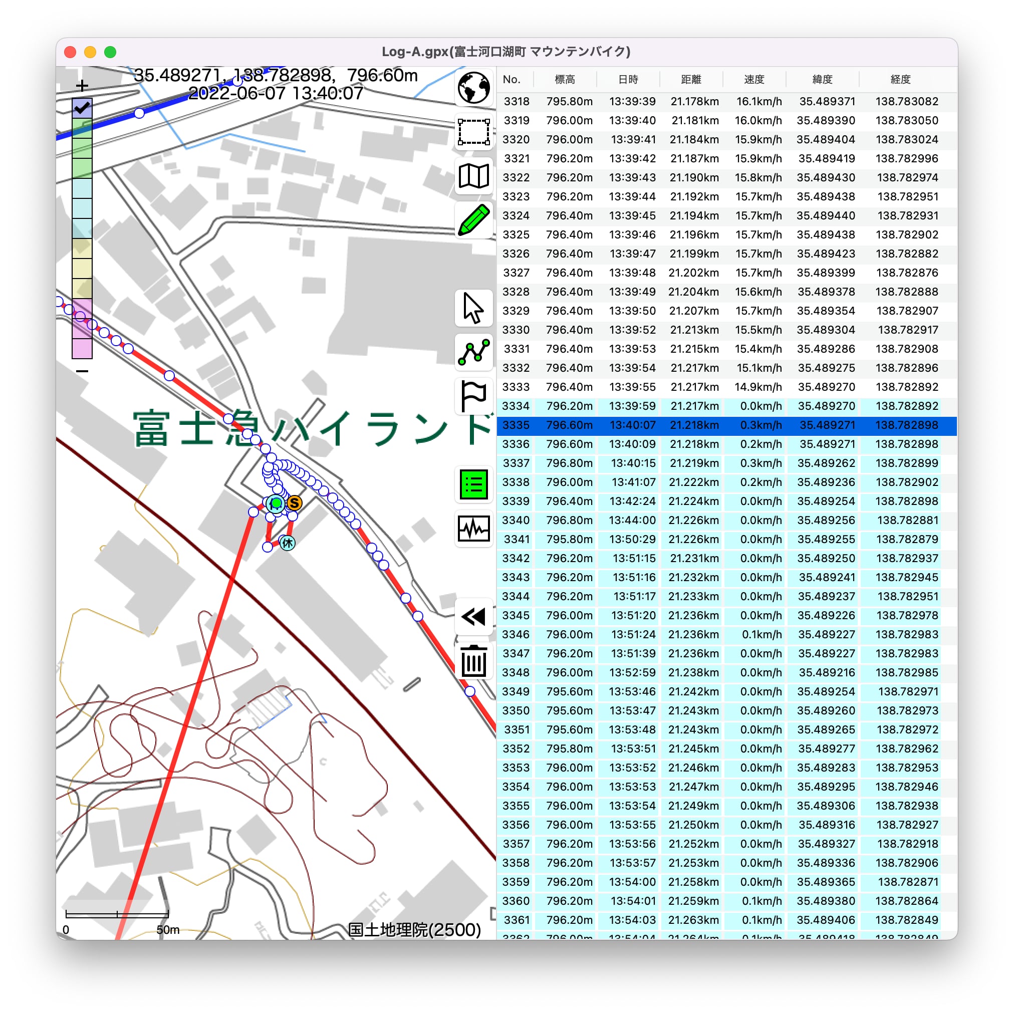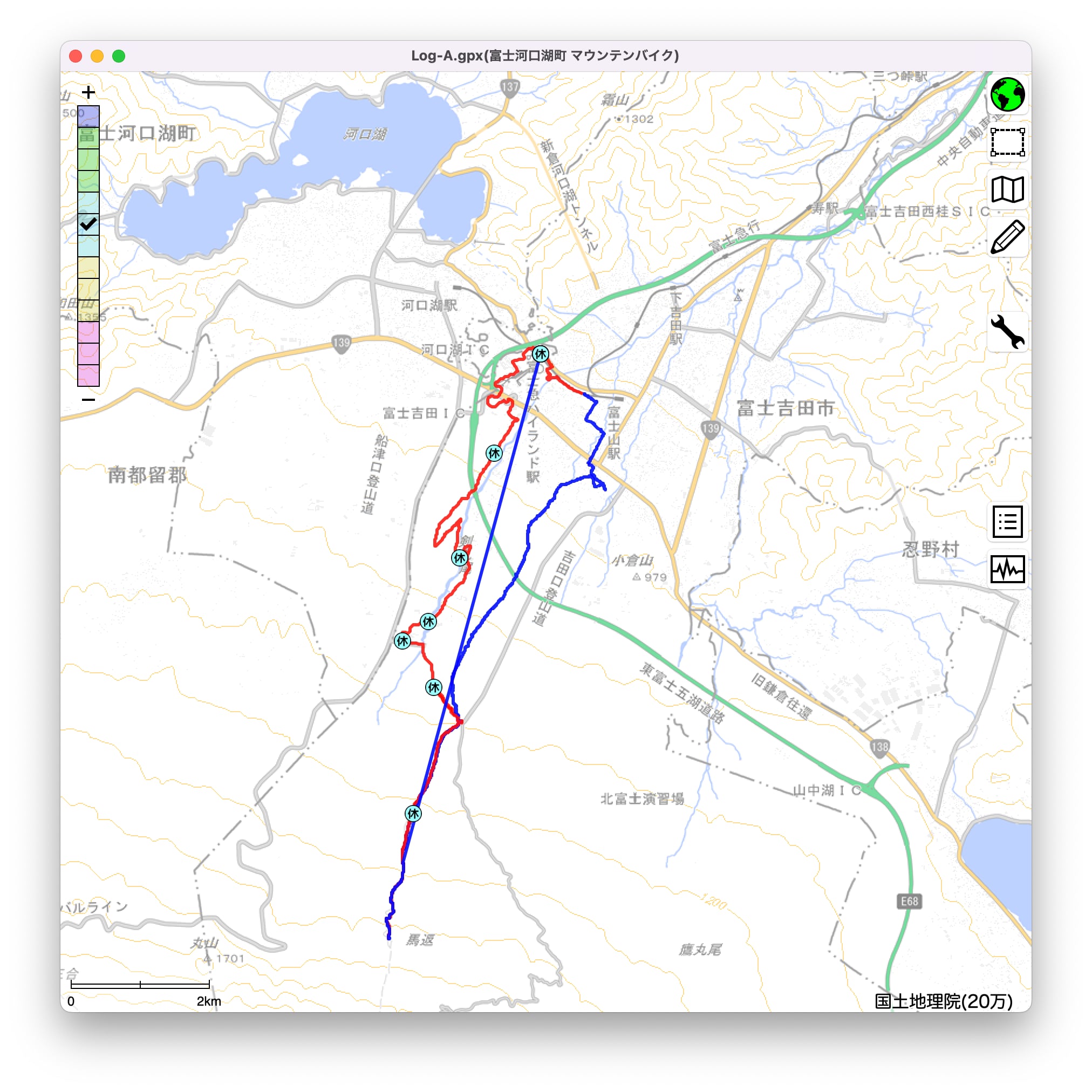 そこで、それぞれのログをGPX形式で書き出しておく。そしてTrailNoteでファイル・メニューから「GPXファイルを開く」を選び、筆者のログ(以下、ログA)を選択する。記録されたログが表示されるので内容を確認しよう。この時は基本画面で、右側のアイコンの一番上の地球アイコンが緑色になっている。走行したルートは実線で描かれ、上りは赤色、下りは青色になる。
