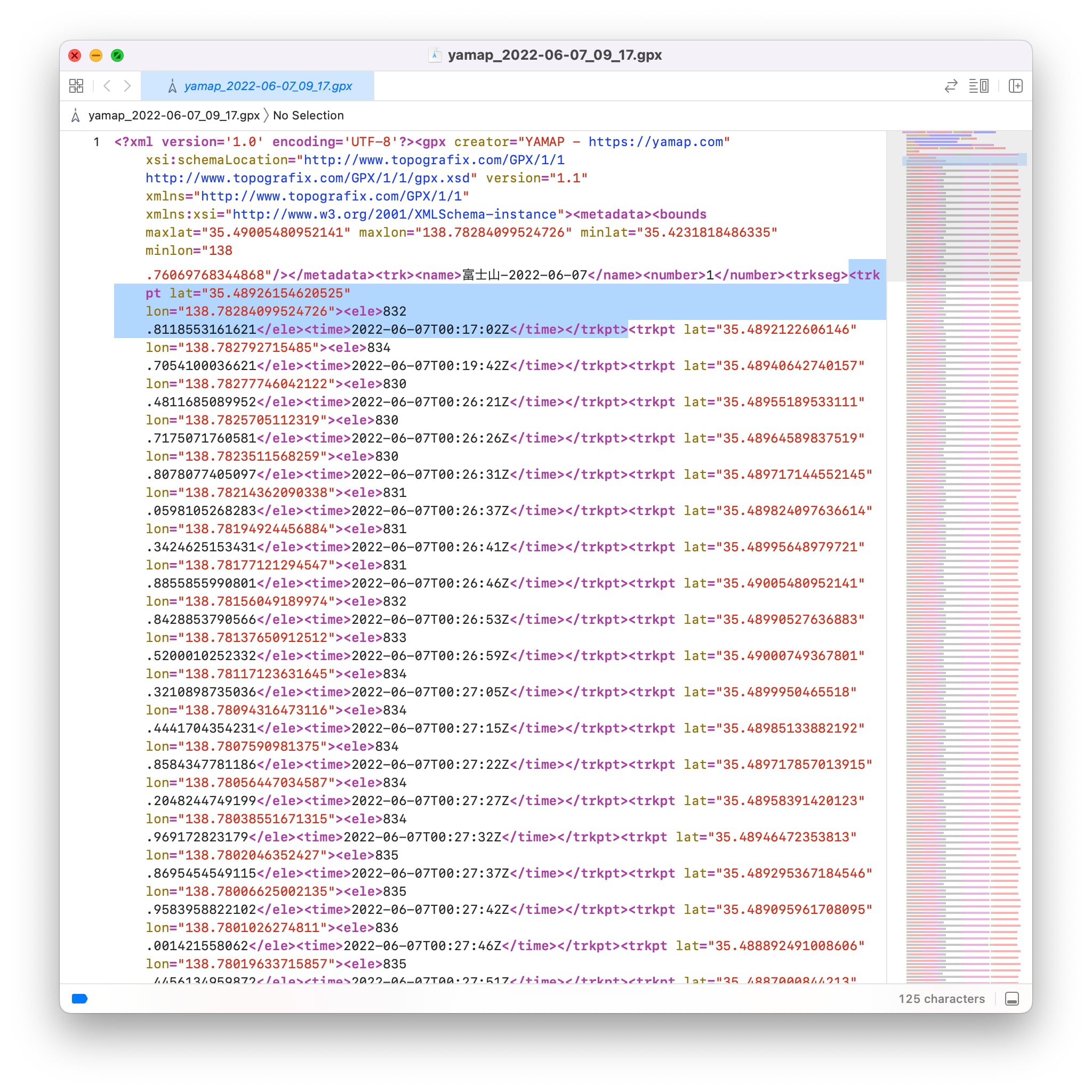 ところでGPXは実際にはXML形式で記述されたテキストであり、テキスト・エディタで開いて内容を確認することができる。XMLなので各データの意味は想像できるものの、膨大な数の記号と数値の羅列ゆえに途方に暮れそうになる。ただ、構造は単純で、例えばトラック・ポイントは<trkpt>から</trkpt>までとして並んでいる。簡単な編集ならテキスト・エディタでもできる(かもしれない)。