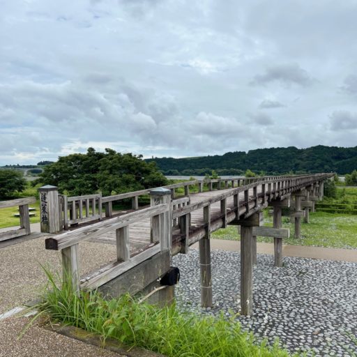 そこで島田市の市街地から大井川の東岸を南下する。堤防道路の一部は車道と並行して自転車道路が設けられている。一段と高い位置から川や河原を眺めながら安全に走ることができるわけだ。やがて蓬莱橋に到着。明治12年に架けられた世界最長の木造歩道橋。全長900mほどと長く、欄干が極めて低いので怖いくらいの開放感。通行料を支払って歩行者も自転車も通行できる。