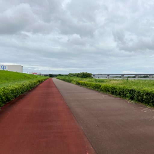 蓬莱橋からは河川敷の自転車道に入る。堤防道路から見え隠れして気になっていたところ、これが平坦で延々と続く筆者好みの道だった。路面の状態が良く、緩やかなカーブと直線が繰り返される。ところどころにトイレや休憩施設もある。実はこれマラソンコース「リバティ」と呼ばれ、大井川河口から18kmに渡って整備されている。クルマ厳禁は当然としても、なぜかジョギングの人もいない。