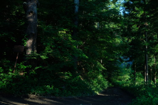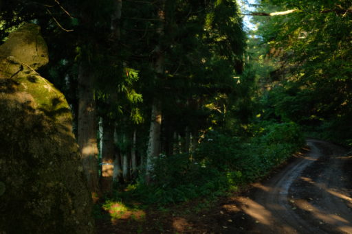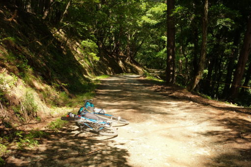高遠からは中央構造線に沿って再北上、板山露頭に寄って市道高嶺線に乗る。手前のトンネルに入るところで、ママチャリに乗った手ぶらの男性とすれ違い驚く。高嶺線は約16キロ、大半は未舗装だ。概ね小粒の締まったグラベルで、傾斜が急なところもあまりないが、北向きは登り基調なので体力を削られる。林の中の涼しさがありがたい。それでも水は確実に減るし、尾根筋では沢水も期待できない。無理はせず、土地と道を楽しみながら長い夏の午後をたっぷり使った。