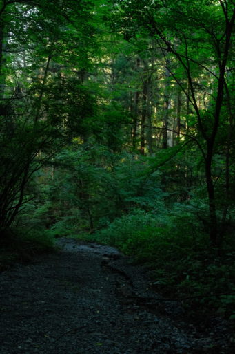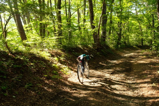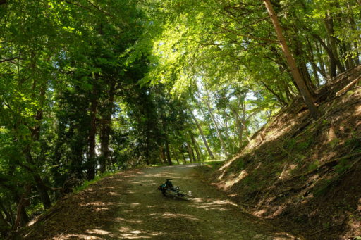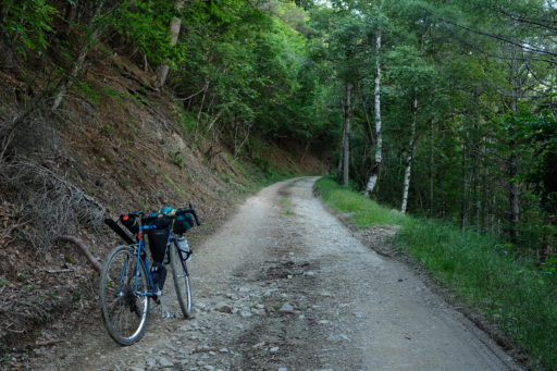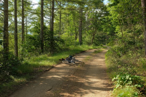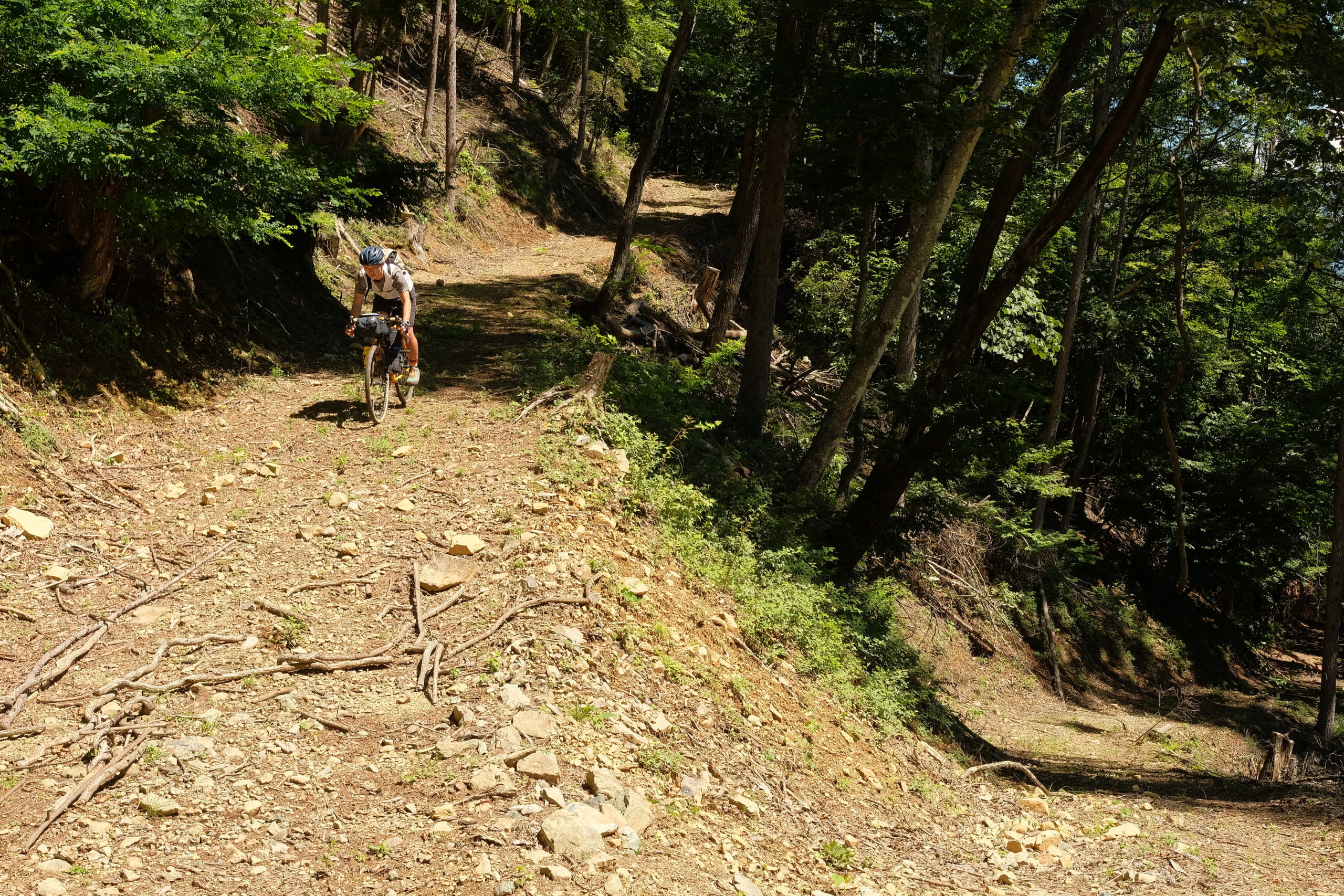 担ぎルートはすぐに終わり、開けた快適なグラベルに出る。これを数キロ味わい、里へ下る方向の枝道に折れる。分かりやすく斜度がついて、路面もややガレに。とはいえ崩落や激しい倒木もなく、集中していれば問題ない。・・・と思っていたが、途中からは沢水が流れる川床林道状態になった。ウェットなので下生えも多く、そのふわっとした覆いの陰に拳サイズの石がいくつも転がっている。自分の車体のリムブレーキでは握りっぱなしでないと十分に減速できず、しかし握り込んでいると身体が固まって突き上げをいなしにくくなる。加えてトゲ植物のつるも伸びている。色々な声を出しながら、大過なく切り抜けた。