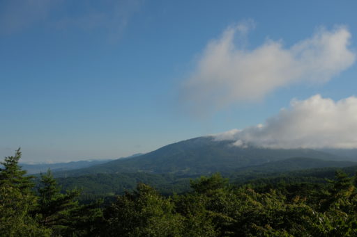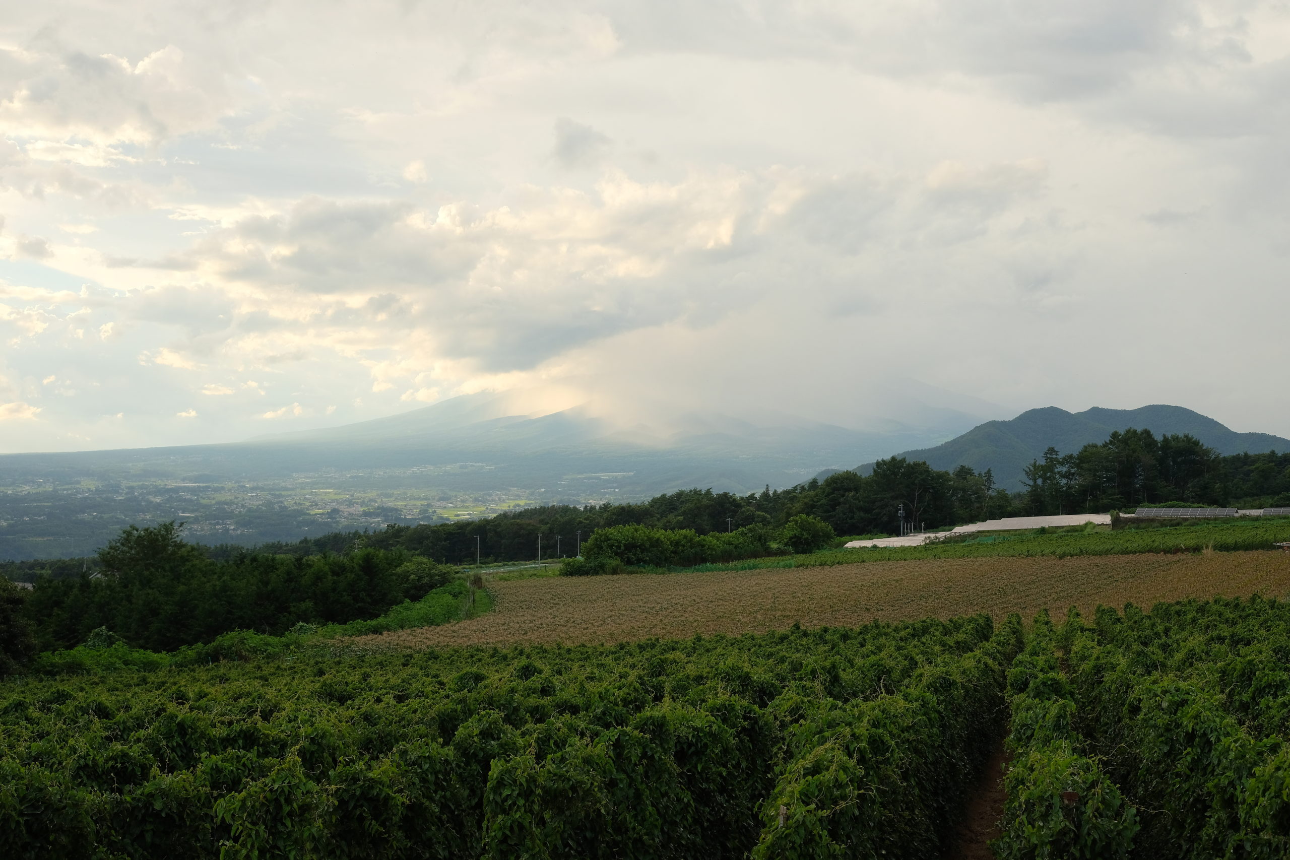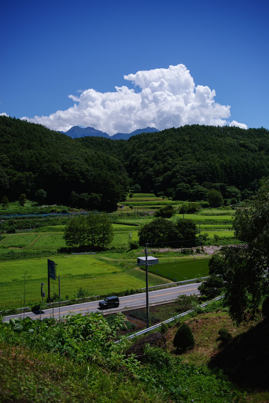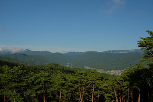 須玉は須玉川と塩川の流れる谷にある。予約を取ったキャンプ場は茅が岳の方にある。平均斜度10%のこのヒルクライムで(後で計算してみて分かった)、既に怪しかった翌日の計画は完全に吹き飛んだ。疲れがたまって前に進まない。区間によっては押し歩きの方が楽で速い。途中にある日帰り温泉も、寄っている時間はないし再び汗だくになるのでパスすることにした。何度も足を止めて振り返る。農場が広がる高原の見晴らしは素晴らしく、富士方面から南アルプス、八ヶ岳までが一望できた。