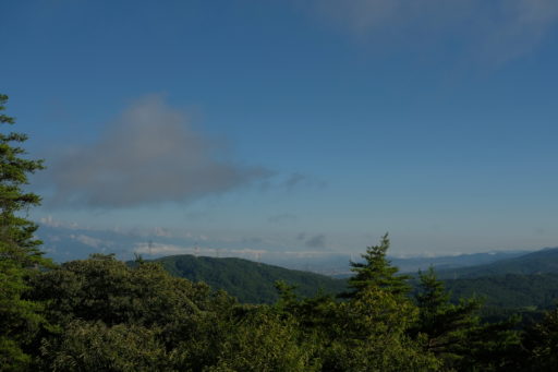 三沢峠/小野峠で舗装路へ出てすぐ左手の砂利道に折れると、道は枝垂栗の展望台に続く。櫓の上で休憩しつつ朝の信州をひとしきり見渡す。さて再出発、というところに一台の車が現れ、三頭の犬を連れた方が散歩に降りてきた。短い交流と情報交換の後、自分は辰野方面へ。