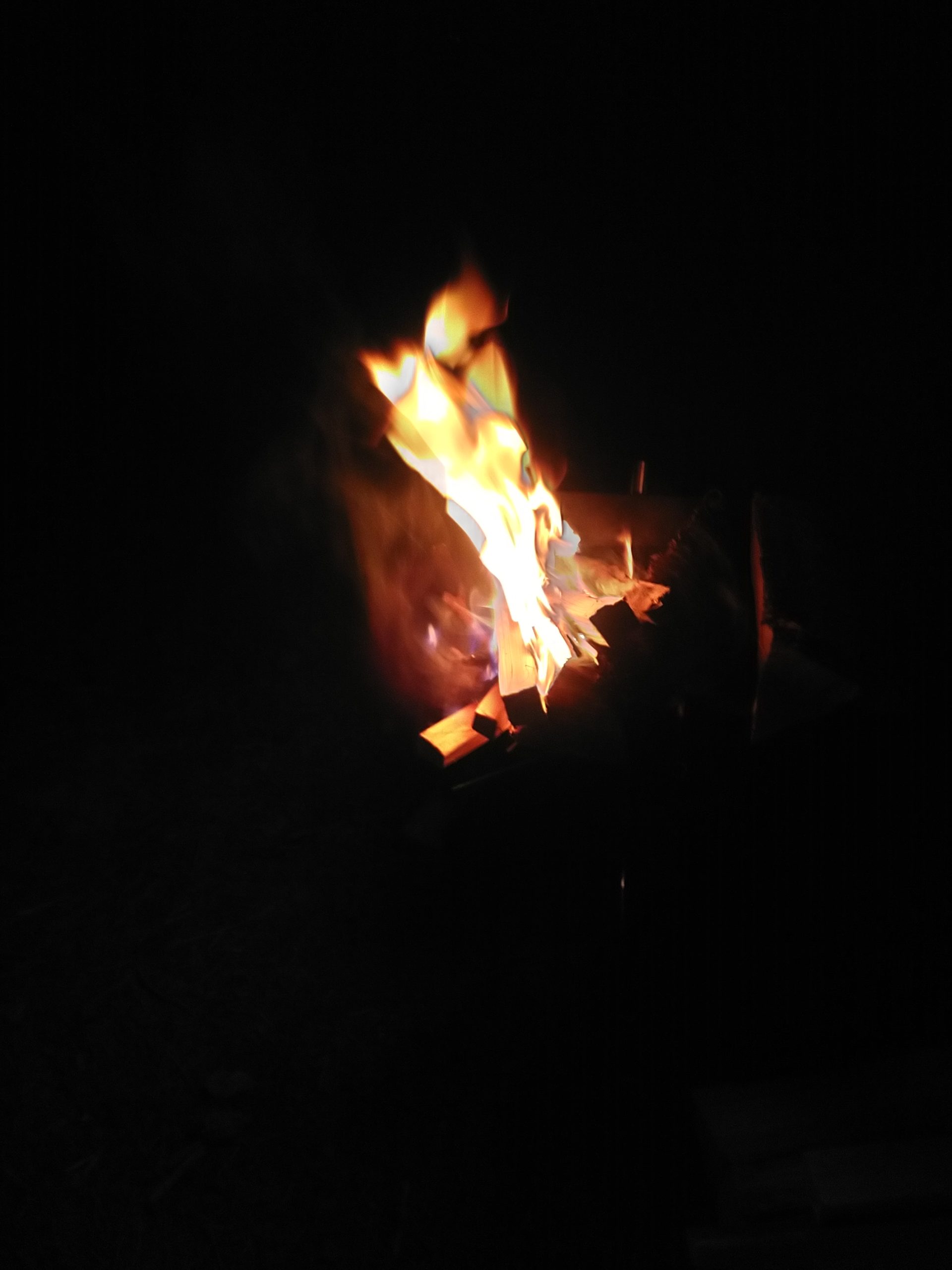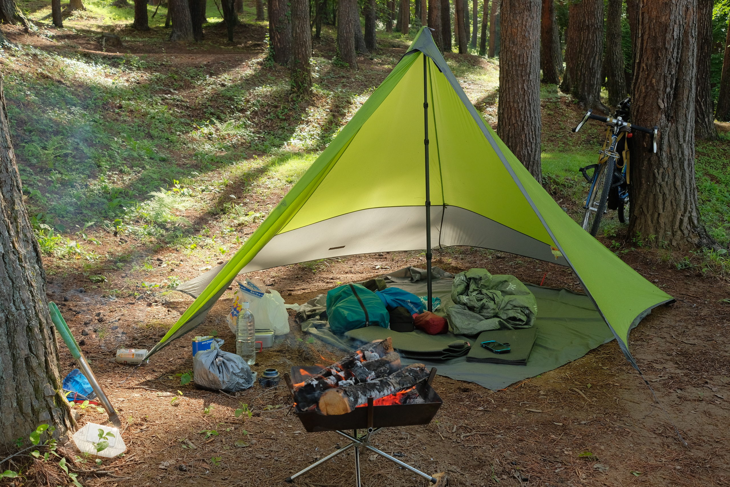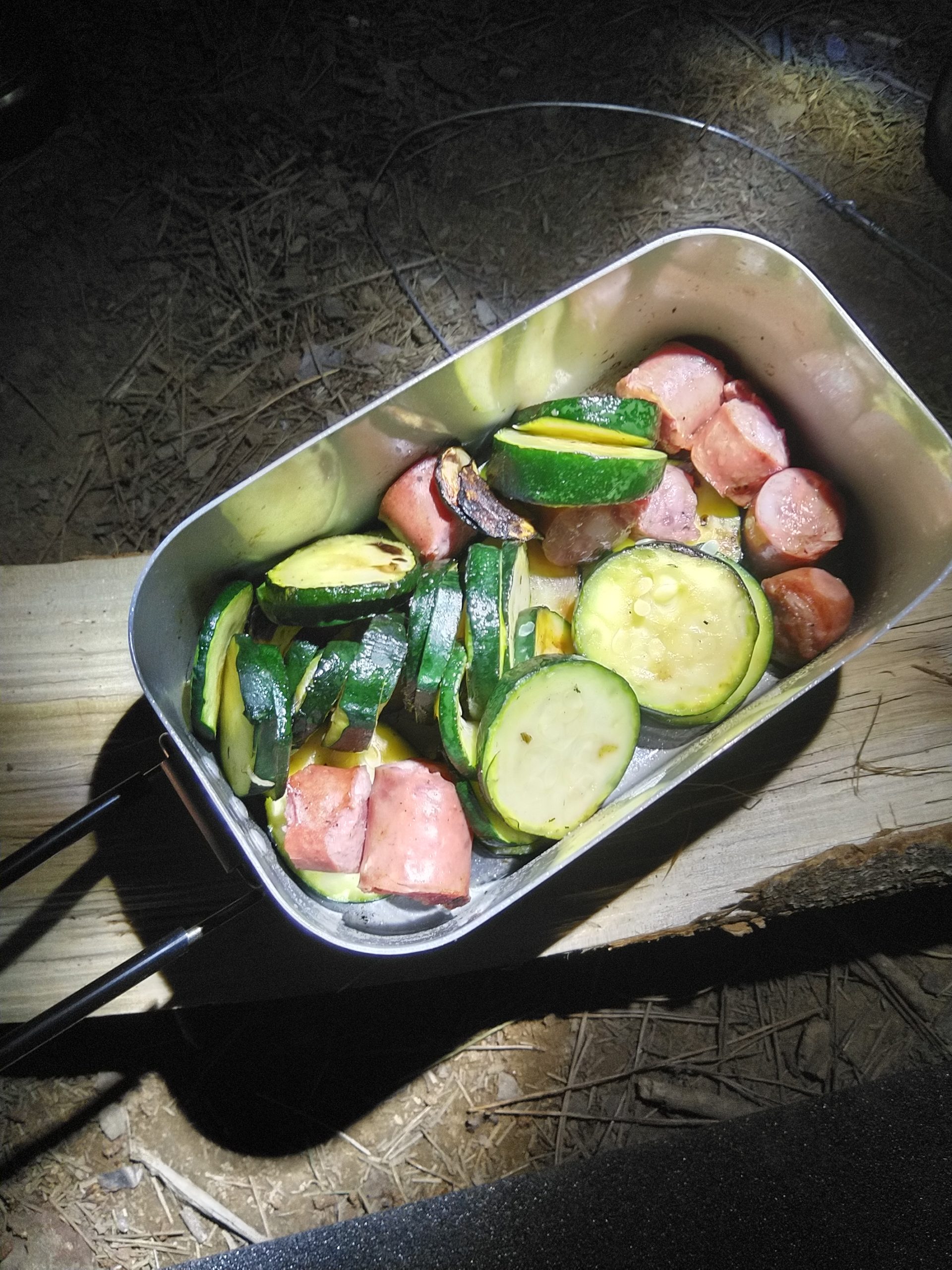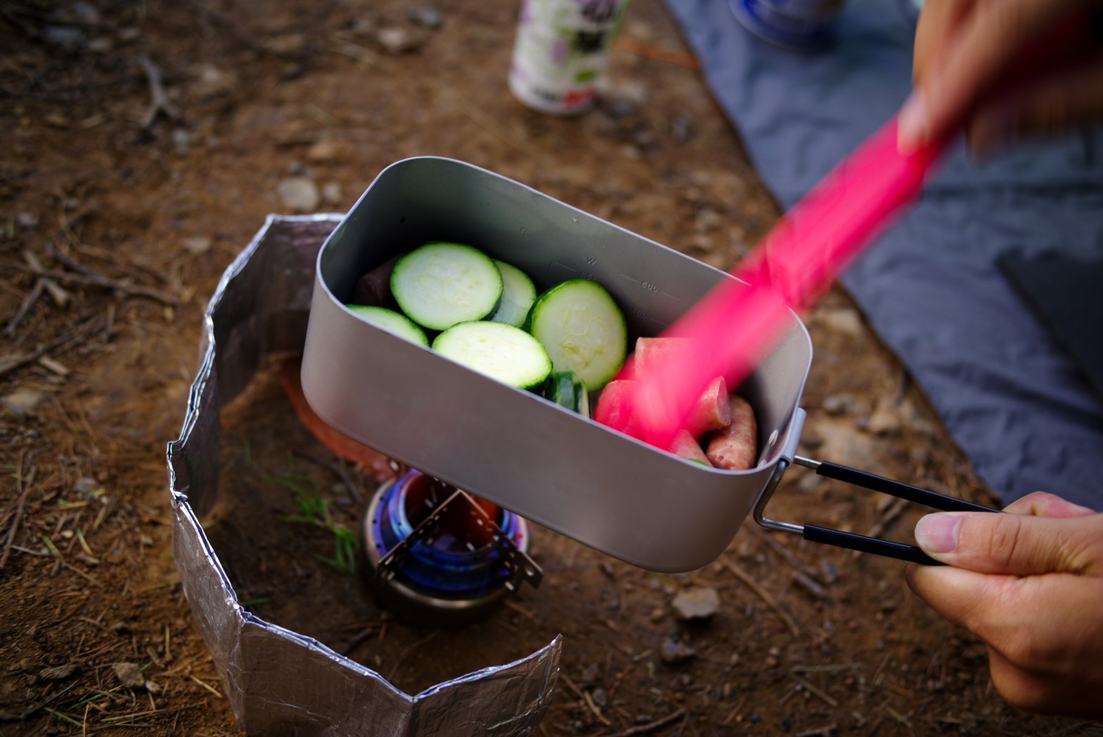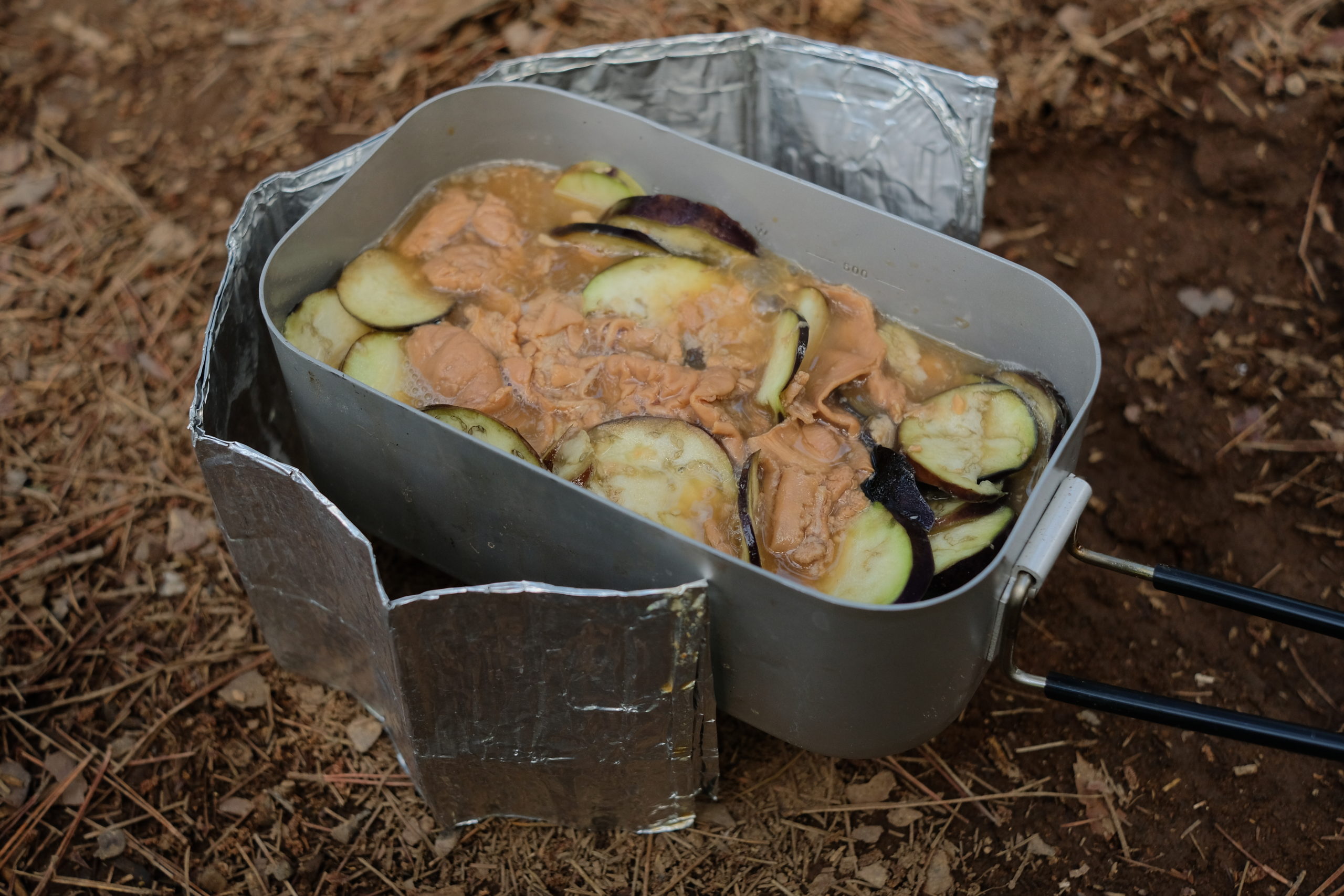 キャンプ場はかなり設備の充実したところだった。スタッフの対応もフレンドリーかつプロフェッショナル。シェルターを張った後に管理棟でシャワーを浴び、焚火台を借りて薪と鹿肉ソーセージと燃料用アルコール(尽きていたのに須玉の町では補充を忘れていた)を買った。サイトに戻って焚火、夕食。夜食か朝食に、と思って茄子を切りながら「結局のところソロで消費できる地物はワンパターンになるな」などと考えていると雨が降ってきた。