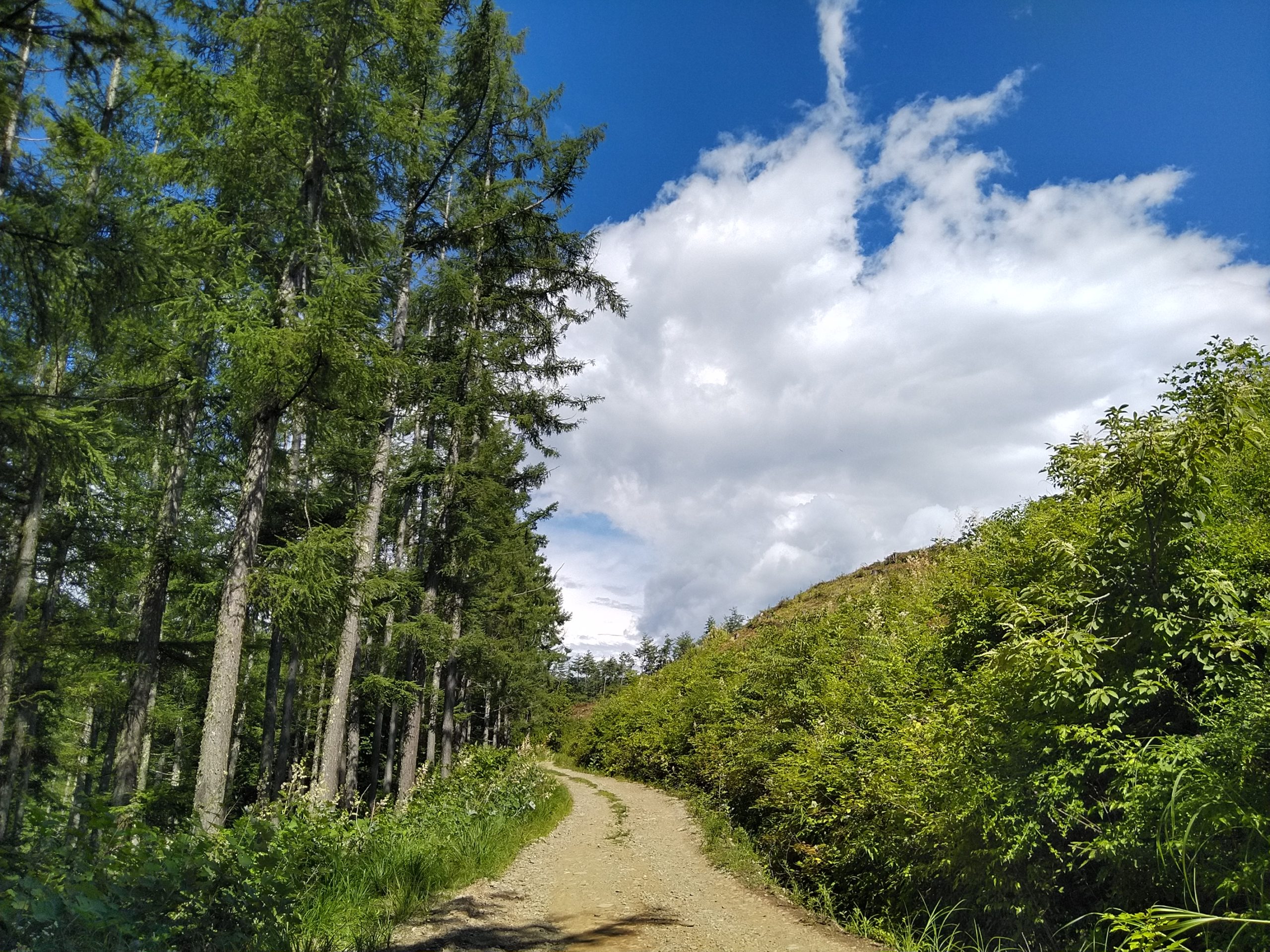 展望台の道をそのまま進むと林道王城枝垂栗線に入る。全長10キロ強、うち山側の8キロ程度は快適なグラベルだ。薪炭林としての利用がメインだったのだろうか、落葉広葉樹の多い明るい山で、「茸山につき立ち入り禁止」といった看板が道脇に点在する。紅葉の時期もいいだろうな。
