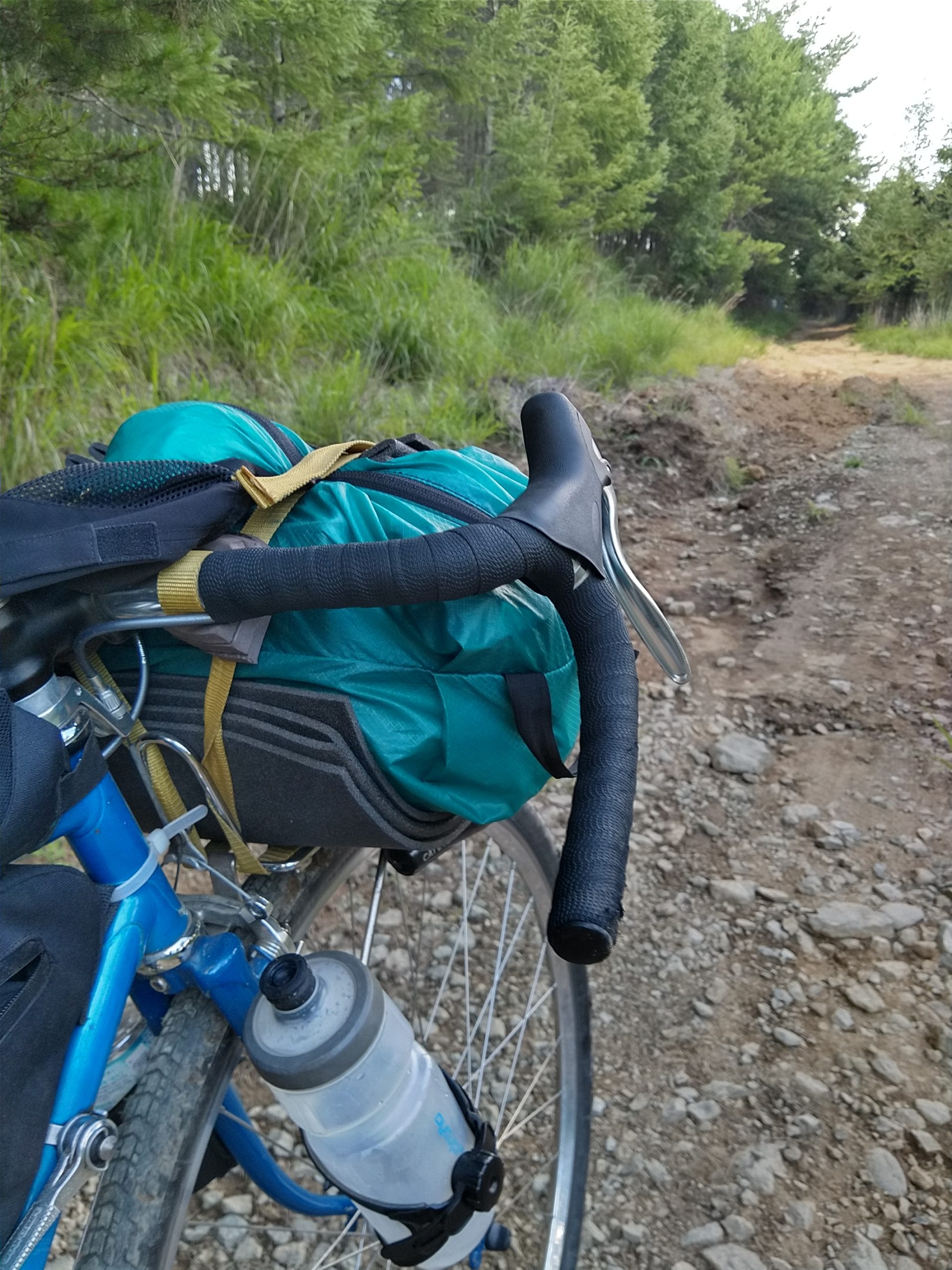 • サドル後ろ:輪行袋として使えるグラウンドシートをスタッフサックに入れてくくりつけている。テールライトも一つはここに装着。