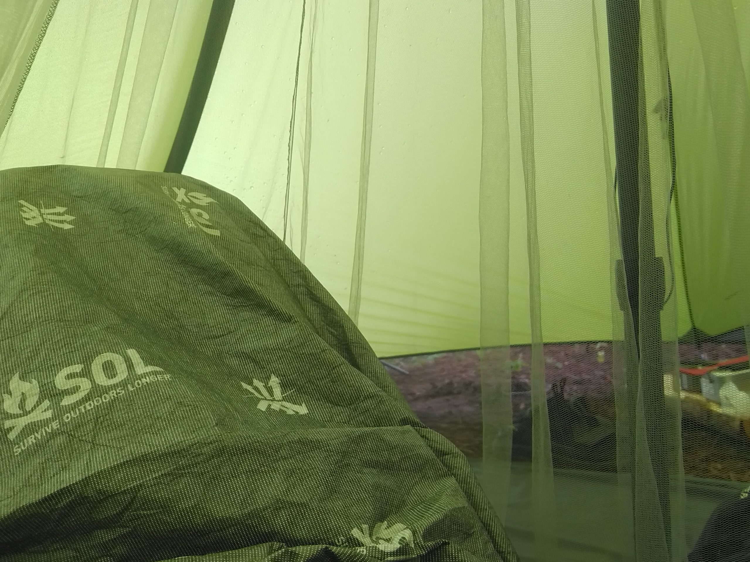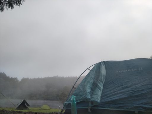 雨は次第に強くなり、フロアレスシェルターの外縁からは跳ね返った水が中に入ってきた。グラウンドシートを折り返して陣地を縮小すると、その下に水溜まりが生じ始めている(設営場所の選定も甘かった)。細い薪で地面に排水路を掘り、確実といえそうな寝床をどうにか整えて炊事場に一時避難。空が光って雷鳴も轟いていたからだ。天候が落ち着いてシェルターに戻ったのは日付が変わる頃。照明がずっと点いている炊事場ほどではないが、自分のシェルターにも虫がやってきて、小枝かと思えばミミズ、という場面もあった。隣人と同居人の線引きの必要性を確信した夜である。