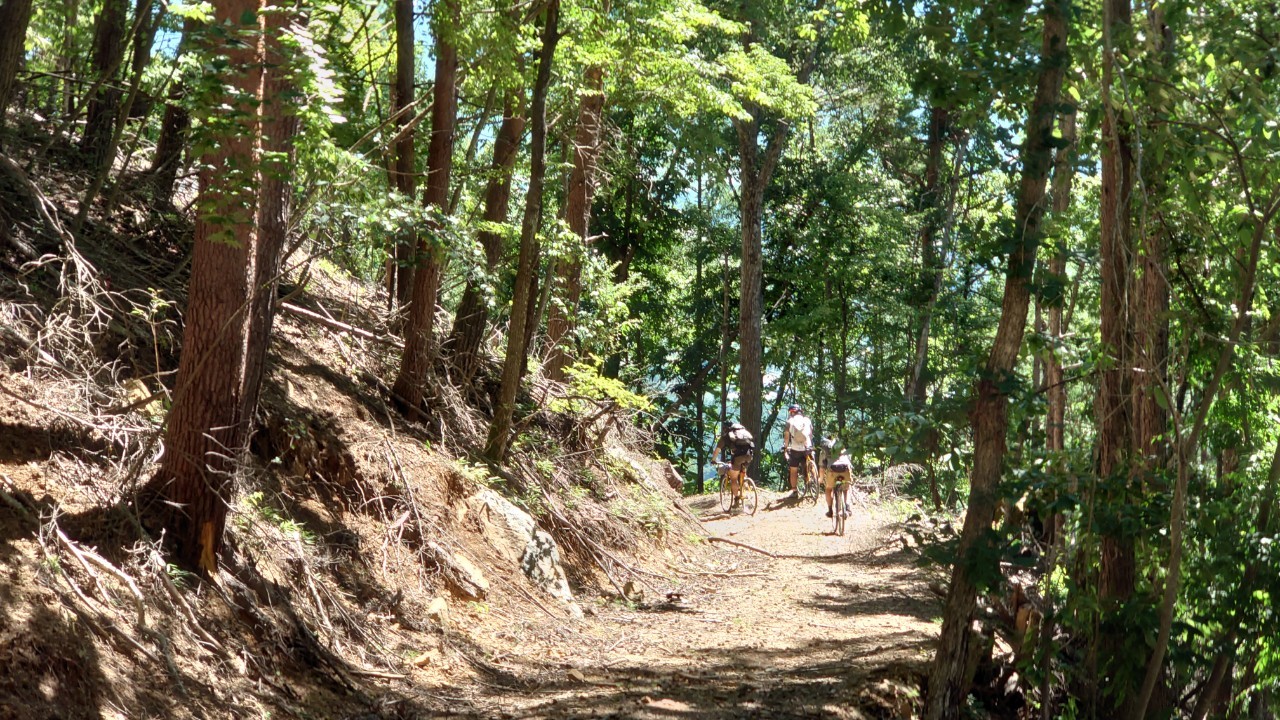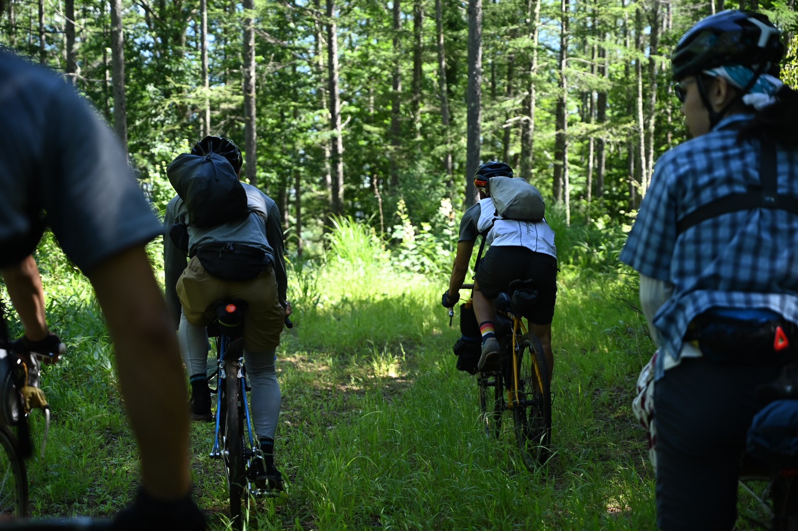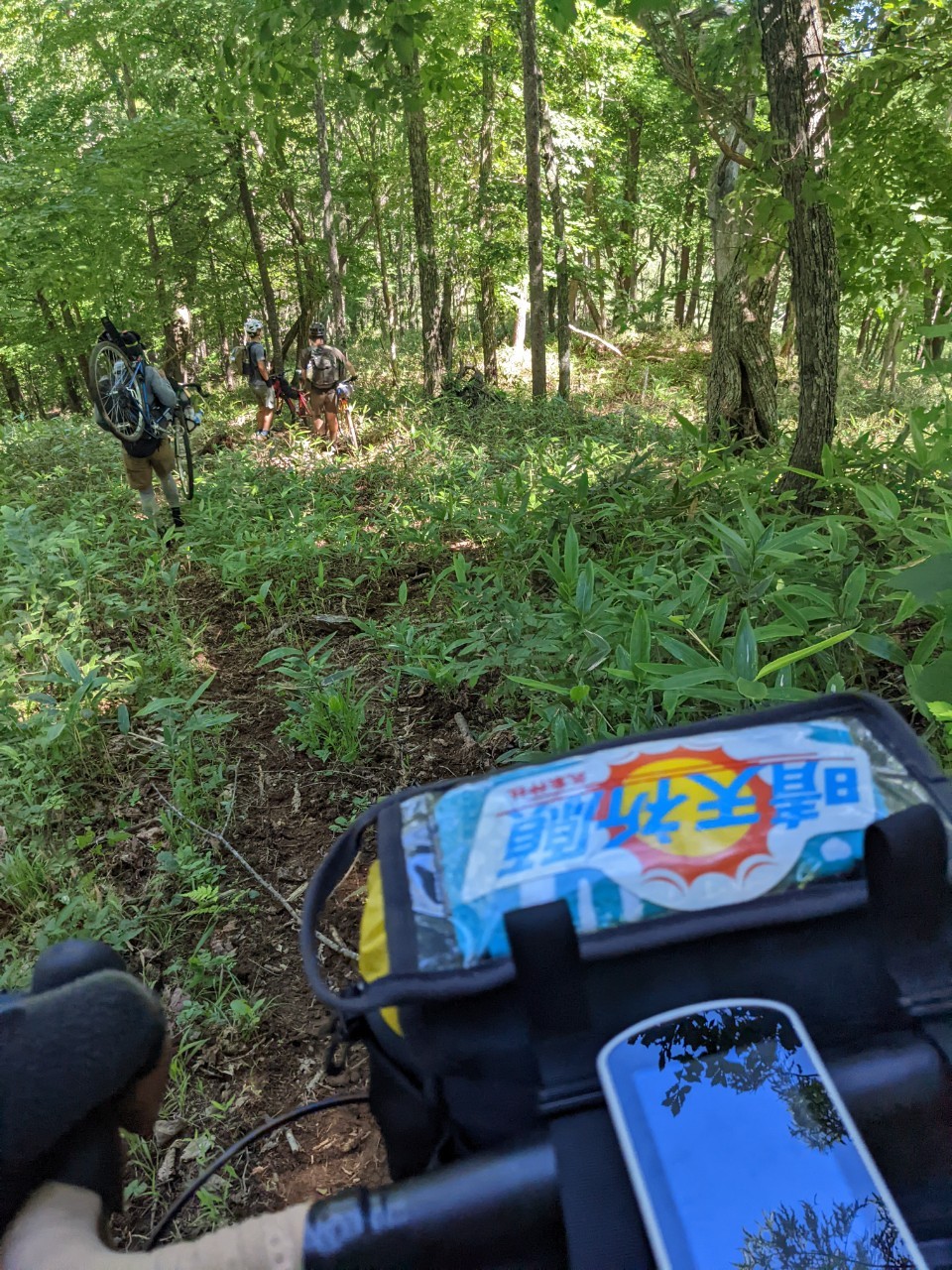 キャンプ地を出てまずはちょっとヒルクライム。朝は気持ちはフレッシュだが、足腰はすぐに昨日の疲労の蓄積を知らせてくる。峠からは未舗装のダブルトラック林道に入る。楽しく下っていくも、やがて草が深くなってきて行き止まりと判断。引き返して迂回する班と、別の林道への踏み跡を徒歩(担ぎ)で辿る班に分かれた。