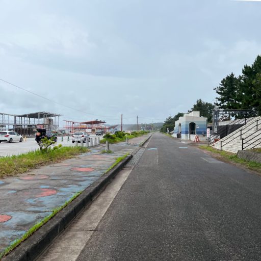 やがて国道150号に入ると専用レーンはなくなり、車道脇の青い矢羽根だけになる。道幅は狭く交通量も多いので走行環境としては劣悪。間もなく波模様に自転車が描かれた丸アイコンが海岸へと誘う。なんとこれ、太平洋岸自転車道​のマークらしい。泣く子も黙るナショナル・サイクル・ルートだ。ところが能天気な海水浴場の横を抜けると再び狭隘な国道150号に戻ってしまう。