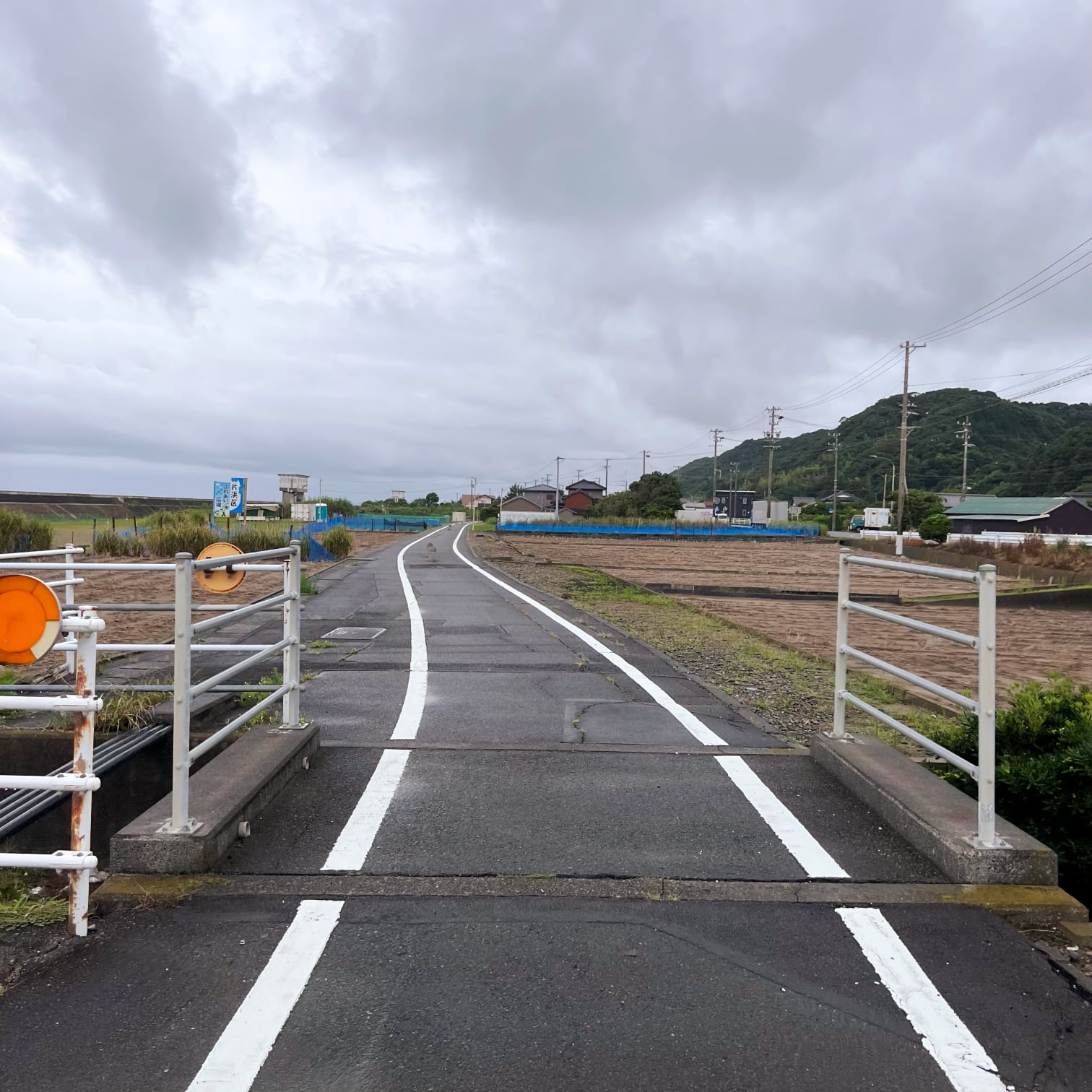 これが「日本を代表し、世界に誇りうる」自転車道とは情けない、と憤慨しているうちに再び波自転車マークが側道に誘う。間違えたかと思うような脇道ながら、田畑を横切り、民家の裏を抜けて、我がもの顔で道が続いている。自転車で走るにはあまりにも快適なので訝しんでいたところ、はたと気がついた。そう、これは鉄道の廃線跡なのだ。後で調べると軽便鉄道駿遠線が通っていたそうだ。