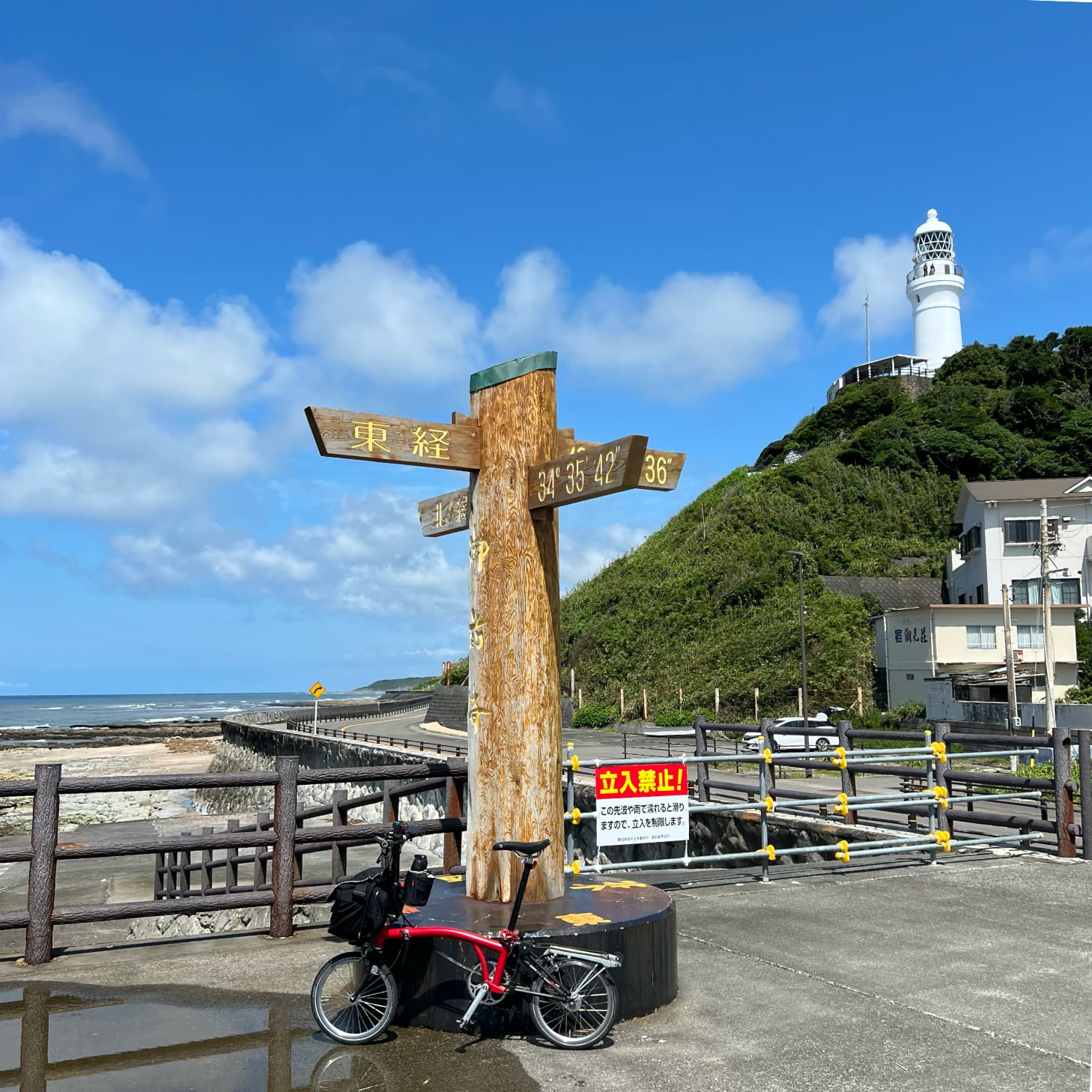 廃線跡はまだまだ続くが、途中離脱して岬へ向かう。青い空と白い雲のもと、ヤシの並木道から海岸道路へと続き、爽快で開放的な南国気分。丘に白い灯台が現れると御前崎。駿河湾と遠州灘を分ける突き出した地形。この日は穏やかだったものの、風が強く波が荒いらしい。砂浜が長く続き、多くの人がサーフィンに興じている。夏の醍醐味は水冷式ライドながら、海水の後味が悪いので海には飛び込めない。