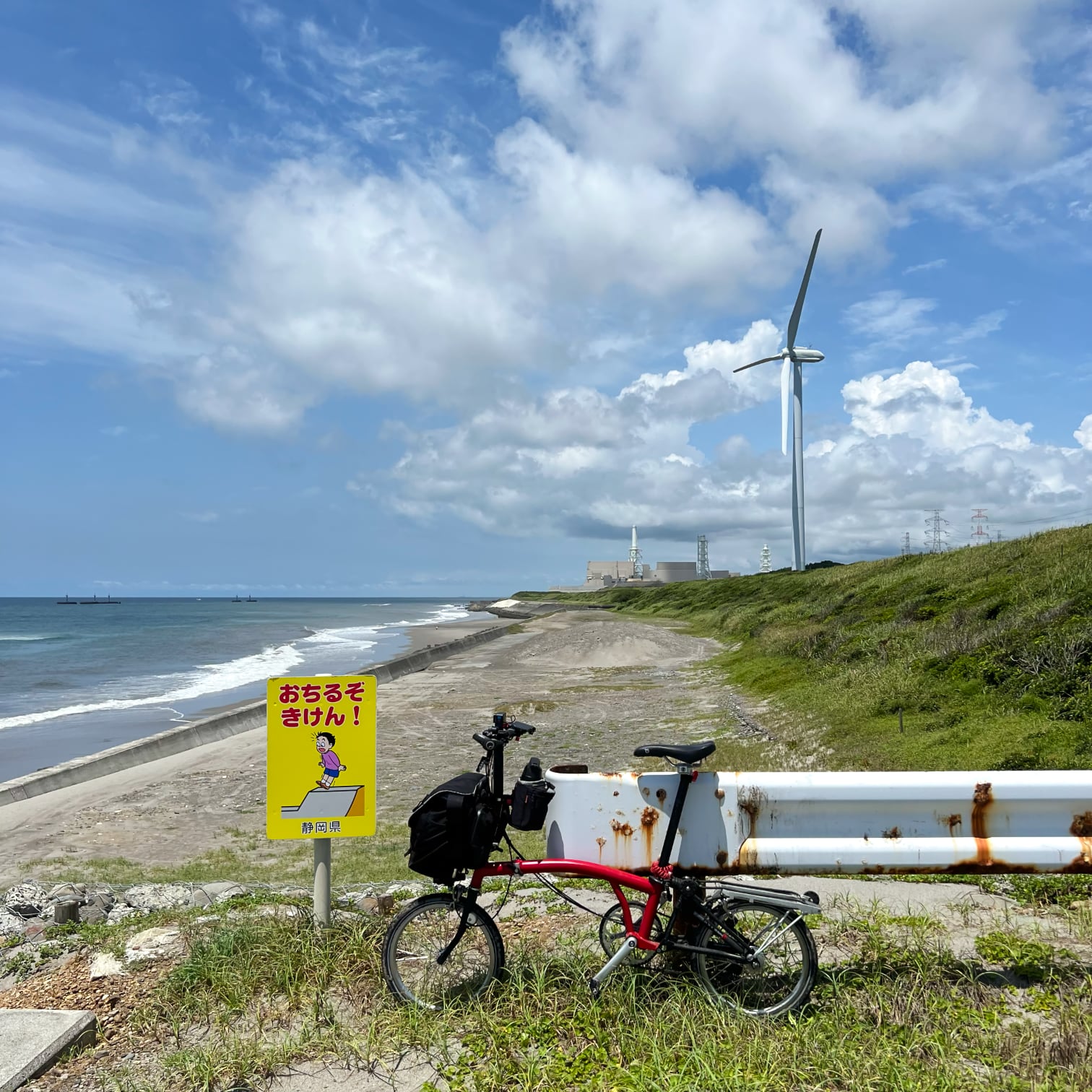 海岸線のライドを楽しむのも束の間、道は内陸にそれてしまう。天下の浜岡原子力発電所があるからだ。すでに廃炉および運転休止中なのが救いとは言え、道路から僅か数百メートルしか離れていない。しかも、この道はナショナル・サイクル・ルートだ。東海地震の想定震源域の中心地であり、薄ら寒い思いに駆られる。付近に乱立する風力発電の白い巨大なプロペラがカモフラージュのよう。
