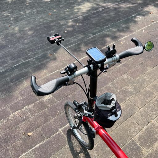 なお、径が小さいBromptonのハンドルバーには問題なく固定できたが、扁平なエアロバーには使えなかった。また、上下にGoProマウントがあるので、サイクル・コンピュータやライトを取り付けることができる。もっともGoPro HERO10を取り付けると、狭角(27mm)でも自撮り棒の先のカメラが映り込んでしまう。とは言え、全体としては完成度の高い便利な製品だと思う。