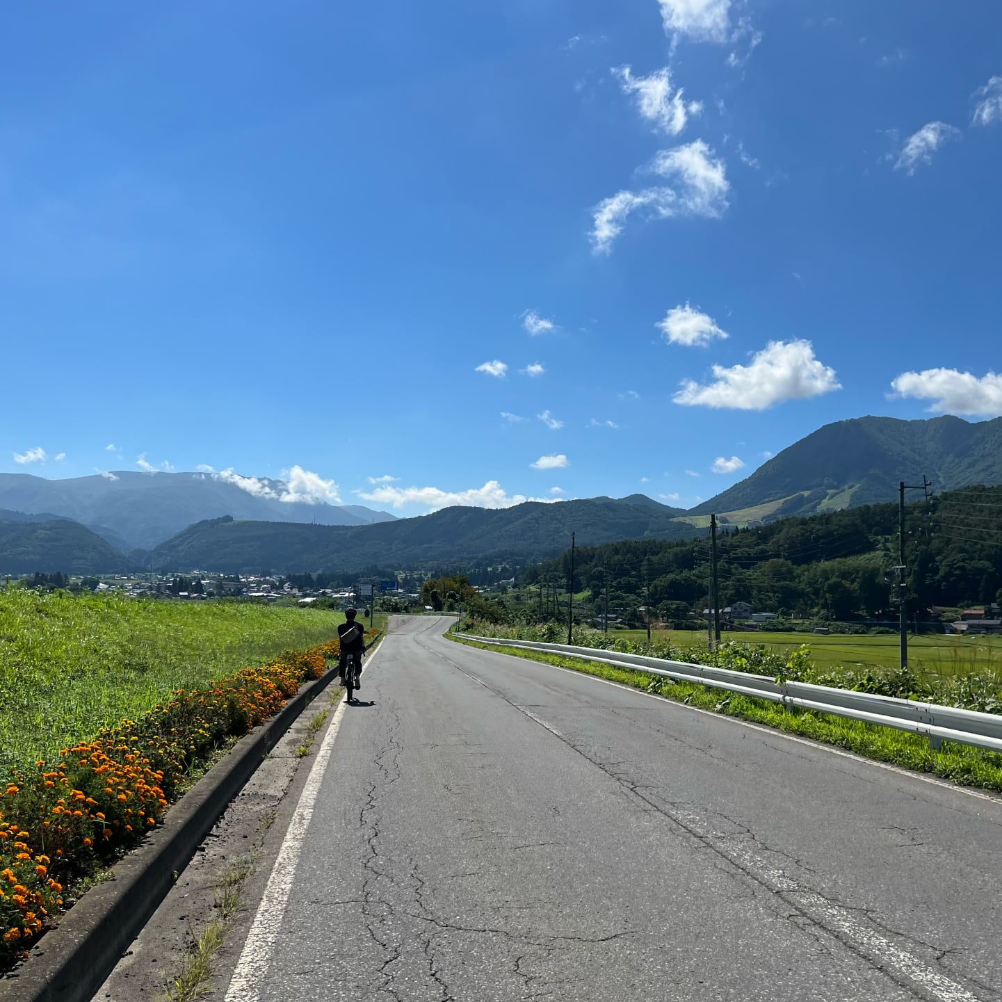 晴れ間の広がる明るい空の下、レンタルした自転車で走り出す。秋の気配がただよう北信州らしい冷ややかな空気。まずはアクティビティ・センターお奨めのルートを辿る。要所要所の路面には案内の矢印がある。千曲川と北信州の山々を眺めながら、穏やかな風に吹かれてペダルを漕ぐ。当初は市街地で交通量もそれなりにあったが、やがて田園地帯に入れば麗しく爽快なライドとなる。