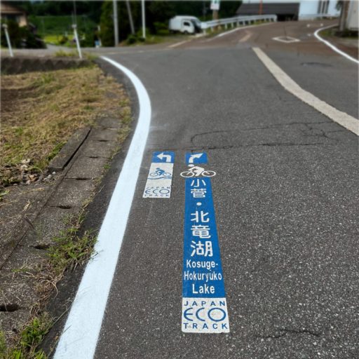 また、路面サインにJAPAN ECO TRACKと記されていることに違和感があった。これは協議会形式とは言え、主体はモンベルの活動だろう。飯山のアクティビティにも貢献しているようだが、自治体予算の投入も少なくない。それが妥当な事業であるとしても、公道に私的なロゴを刻むのは許容し難い…とロゴ嫌いの筆者と同行の知人は強く思った。推奨ルートを離れたのは、そのような事情もあった。