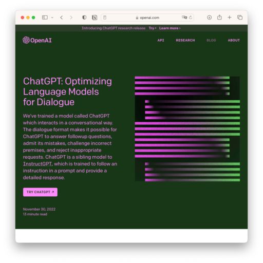 ChatGPTは2022年11月にOpenAIが公開した対話(チャット)サービスで、AIを活用した高度な受け答えが注目されている。昨年の夏に話題を集めたAIによる画像生成に似ていて、こちらは入力したテキストに対する応答をテキストとして返す。内容だけでなく文脈も理解しており、最早チューリング・テストに合格するのではないかと思うほど自然で的確な受け答えだ。