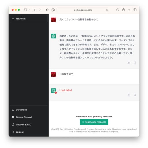 ChatGPTを利用するのは簡単で、OpenAIのアカウントを作成するか、Googleなどのアカウントでログインすれば良い。あとは独り言でも質問でも何かテキストを入力するだけ。コンピュータ・リソースを節約するためだろう、タイピングするように徐々に返事が現れる。このもどかしさが中毒性を高めている。ここでは友人とおしゃべりをするように天候の話から始めて、次第に自転車に話題を振ってみた。