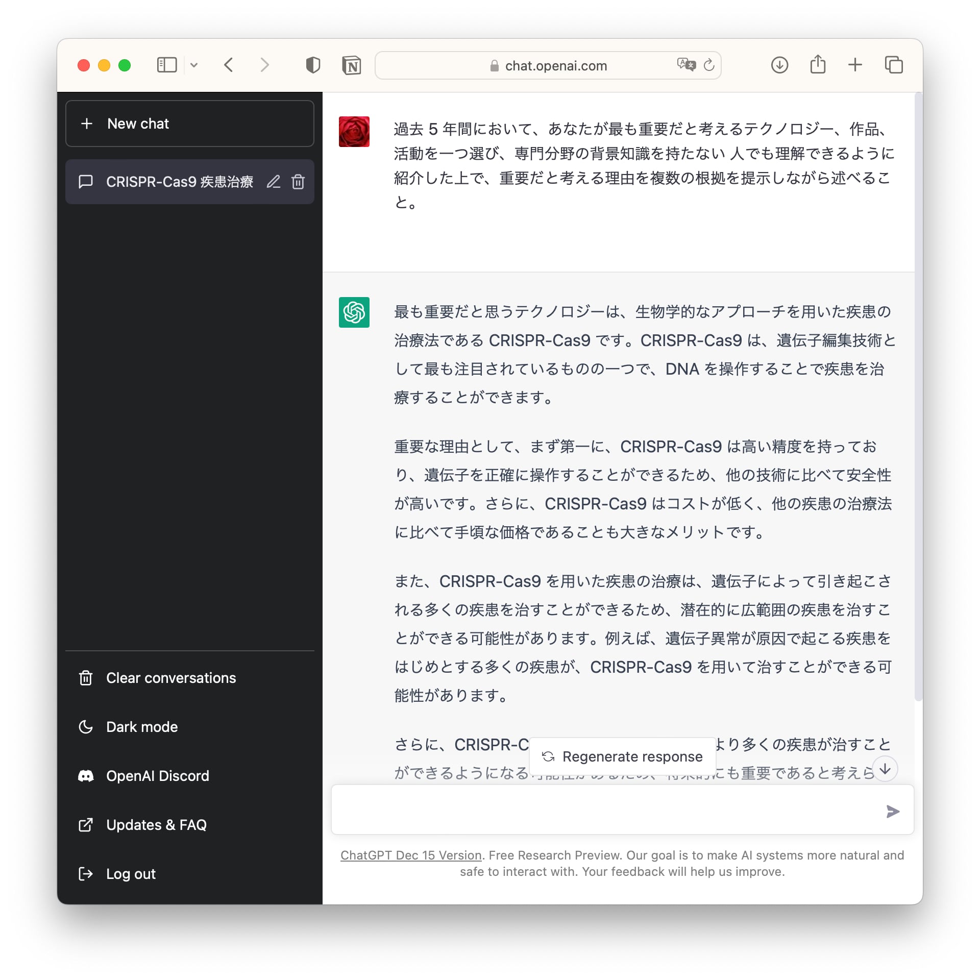 形式的には完璧と思える回答が得られた。ただ、筆者は遺伝子編集技術の門外漢であり、これが妥当か否か判断できない。それにも関わらず、このまま提出すればプリウス・ミサイルだ。そのような場合には、何らかの判断ができるまでRegenerate responseボタンを押すか、質問を修正すると良いだろう。不明な事柄があれば、その点を尋ねて理解を深め、検証した上で文章を推敲することも大切だ。