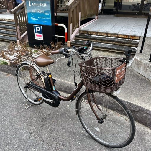 阿智に着いて何はともあれACHI BASE(阿智☆昼神観光局)に赴く。カフェを併設した観光案内所で自転車などのレンタルも行っている。ARサイクリング自体は僅か100円と安価で、ARグラスとスマートフォンが手渡される。自転車は電動アシストのママチャリで、レンタル料は半日1,200円と良心的。ただし、マウンテン・バイクやクロス・バイクはARに対応していない謎仕様。