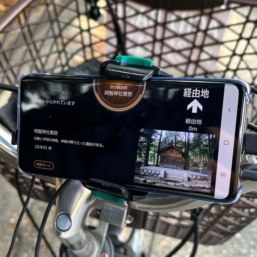 阿智に着いて何はともあれACHI BASE(阿智☆昼神観光局)に赴く。カフェを併設した観光案内所で自転車などのレンタルも行っている。ARサイクリング自体は僅か100円と安価で、ARグラスとスマートフォンが手渡される。自転車は電動アシストのママチャリで、レンタル料は半日1,200円と良心的。ただし、マウンテン・バイクやクロス・バイクはARに対応していない謎仕様。