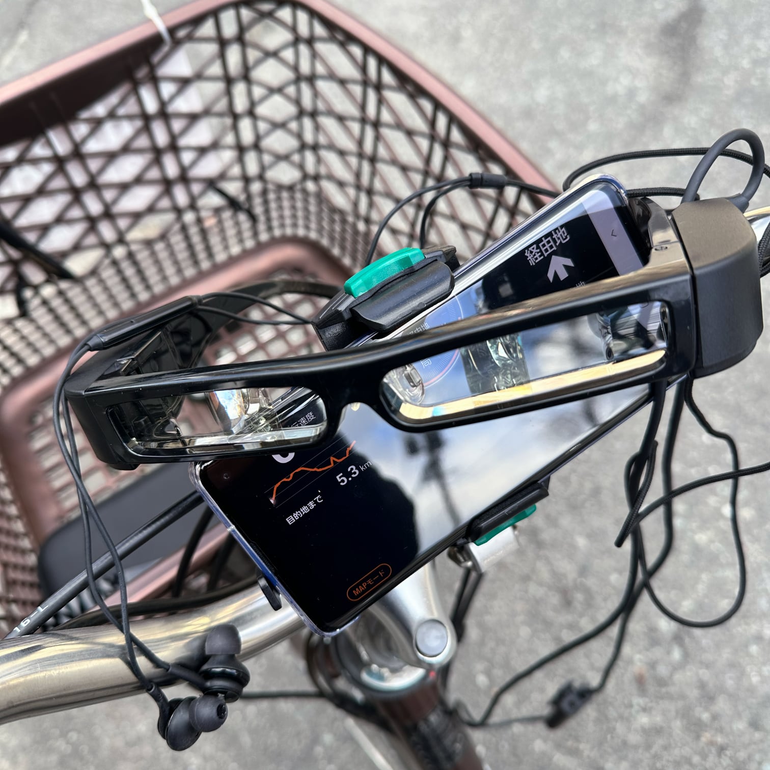 実際のARサイクリングも辛い。アプリはNAVITIMEのカスタム版で最適化されていないからだ。路面振動でARグラスが揺れるにも関わらず、ほとんどの情報が小さいので読み取れない。表示される矢印や写真も的確ではなく混乱する。位置判定が柔軟でなく、特に方向が特定されないのはナビとして致命的。あまりにもストレスなのでARグラスを投げ出し、途中からはスピーカーで音声を聞くだけにした。