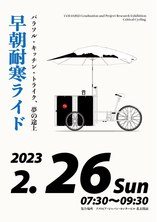 来る2月26日にクリティカル・サイクリング主催による早朝耐寒ライドを行います。これはIAMASのいわゆる卒展のイベントとして行われ、どなたでもご参加いただけます。近隣の方はもちろん、遠方でも少し早めにお越しいただいて、ライドの後に卒展をご覧いただければ幸いです。