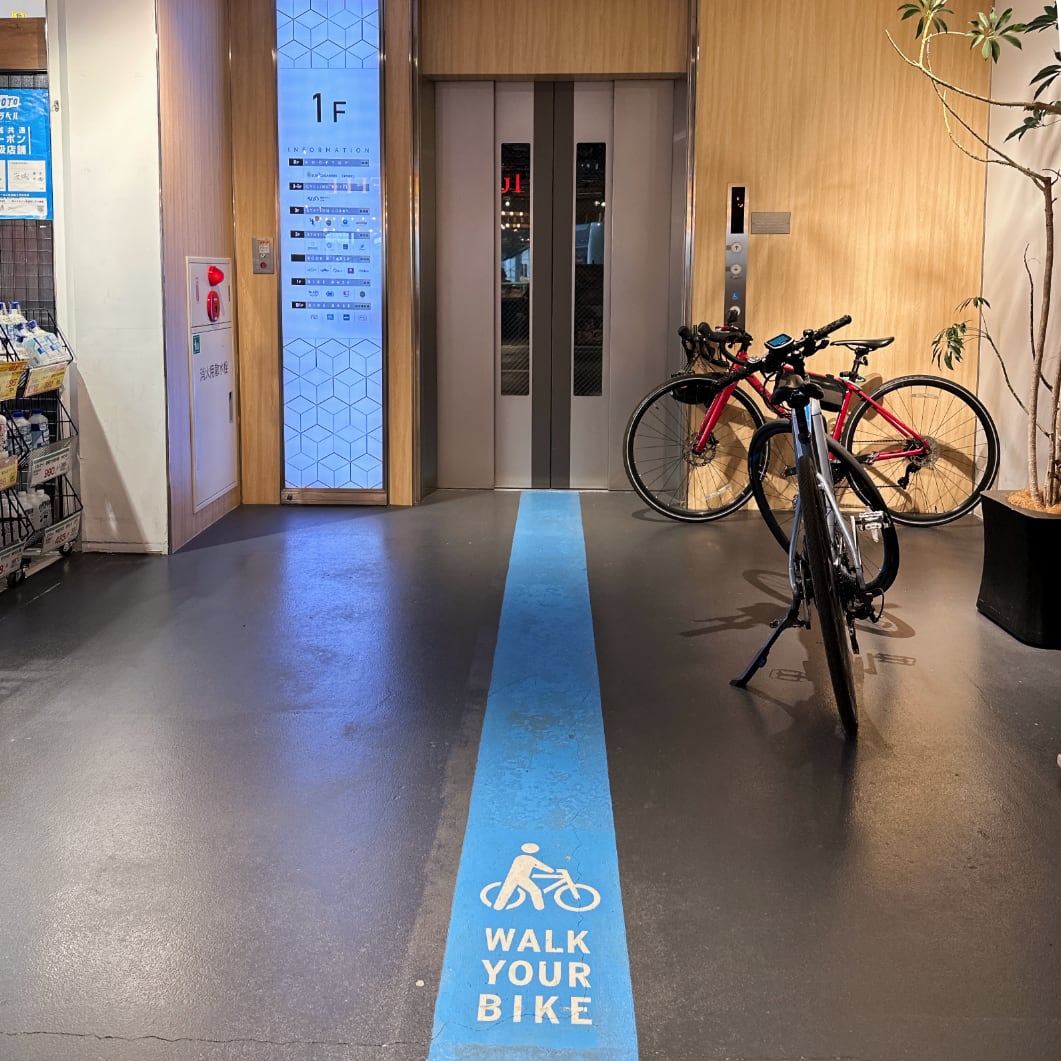 プレイアトレ土浦の真骨頂は、構内を自転車とともに移動できることだろう。何しろ床には自転車マーク付きでブルー・ラインが引かれ、そのままエレベータにも載せられる。通路にはサイクル・スタンドがあり、輪行者のための組み立て場所もある。欧米では当たり前でも、土足禁止を引きずる日本の施設では稀有な配慮だ。これこそが日本最「上」級のサイクリングリゾートの証と言える。