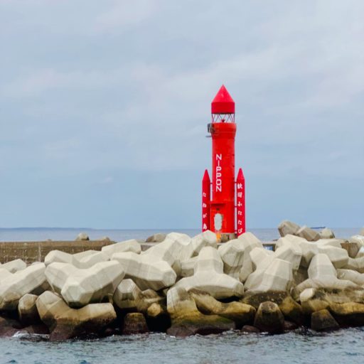 屋久島一周(ヤクイチ)ライドは叶わなかったものの、種子島への高速船の出航には間に合った。貨物料金を支払い、自転車を輪行袋に入れて運び込む。水中翼船なので揺れや振動がなく、夕暮れの穏やかな海を滑るように進んでいく。宮之浦港から西之表港まで45分間、最高速度は時速80kmを超えるそうだ。種子島では可愛い赤灯台が出迎えてくれる。そう、ここはロケットの島だ。