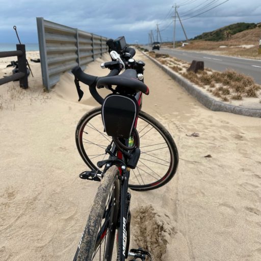 ともあれ、種子島の南部から中部にかけては高台になっており、北西の海岸に向けて緩やかに下っていく。海岸線の道路は平坦で直線的、海が近く開放的で気持ちが良い。交通量も少なめで、車道から分離された自転車レーンが設けられている区間もある。ただし、その自転車レーンが砂で埋まっていたりもする。今回は走っていない東部はサイクリング情報によると走り甲斐がありそうだ。