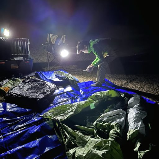 軽トラックで1時間ほどかかって種子島南部の宇宙ヶ丘公園に到着。すでに辺りは薄暗い。小降りながら雨も降ってきた。小さなライトを頼りにテントを張る。同行した知人も筆者もキャンプ経験はゼロ。片隅にあった説明書に気が付かず、パズルのように試行錯誤する。そして島の夜は早い。なんとか食事には間に合ったものの、温泉は諦めざるを得なかった。