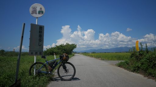 米原で輪行解除、当てずっぽうで琵琶湖の方へ。8月末にして、やっと夏休み感をつかまえることができた気がした。今回の自転車キャンプ積載はこれが全て。人間が持つ荷物は貴重品とカメラくらい。