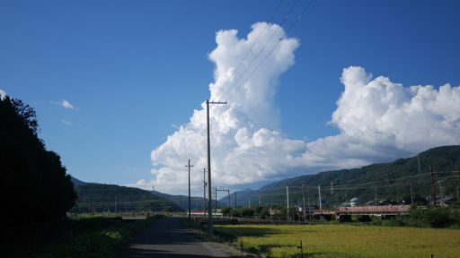 道の駅に寄ったりしたのち、琵琶湖から逸れて余呉の山あいへ。北陸本線も走る余呉川の谷の向こうに、立派な積乱雲が育っていた。夜になって稲光をちらつかせた雲だ。近くの神社は祭礼の日らしく、サウンドシステムからヒップホップが流れていて面白かった。