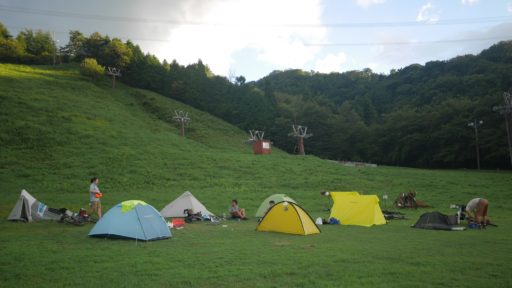 集い開催地のスキー場。それぞれ思い思いのルートでやってきて一夜をここで過ごす。平坦に見えても少し傾いているところがほとんどで、設営が微妙に大変。蚊もそれなりにいる。